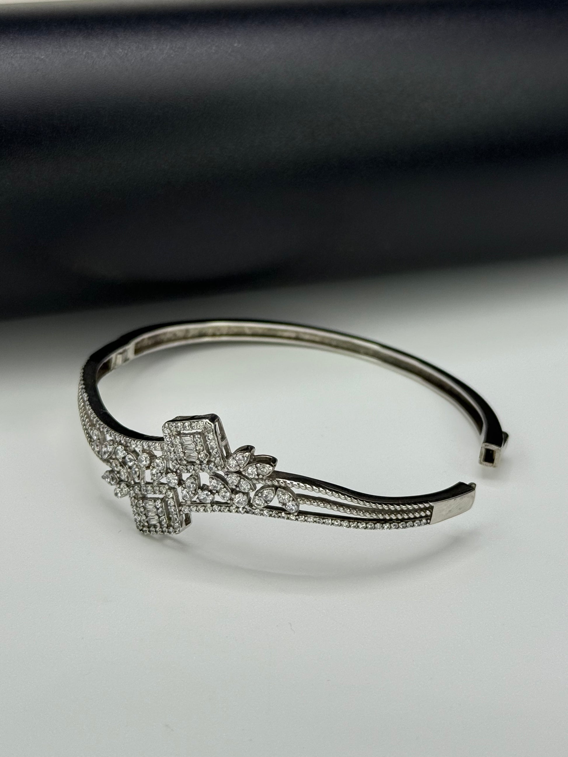 An exquisite 12.4 gram 925 silver bracelet featuring a delicate floral motif and square-cut zircon centerpiece. Designed with triple band detailing and shimmering stones, this piece adds timeless elegance to any ensemble.