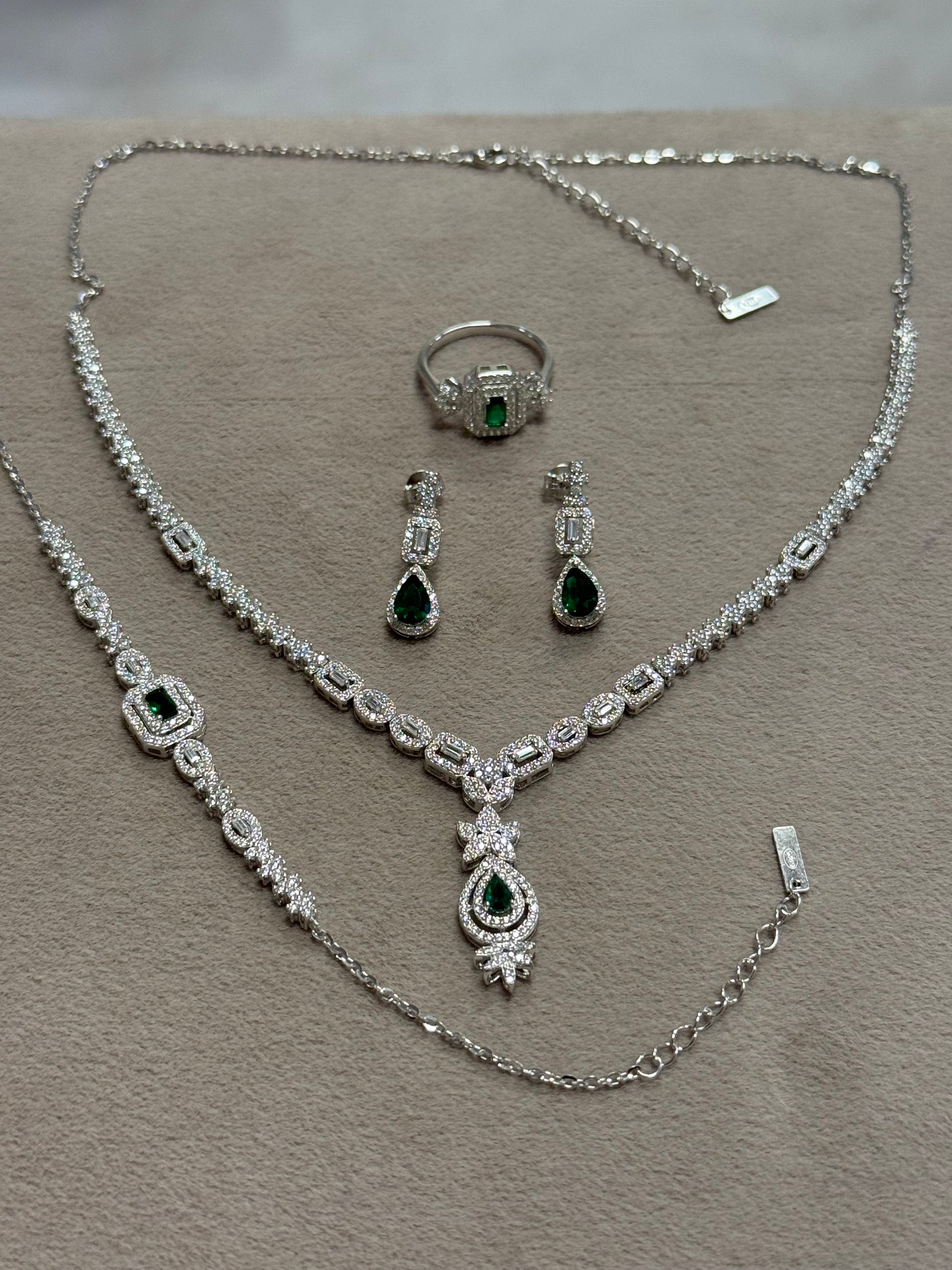 A complete, rhodium-plated 925 silver collection featuring a necklace, matching tops (earrings), ring, and bracelet. The combined weight of 23.7 grams guarantees a luxurious, quality feel.