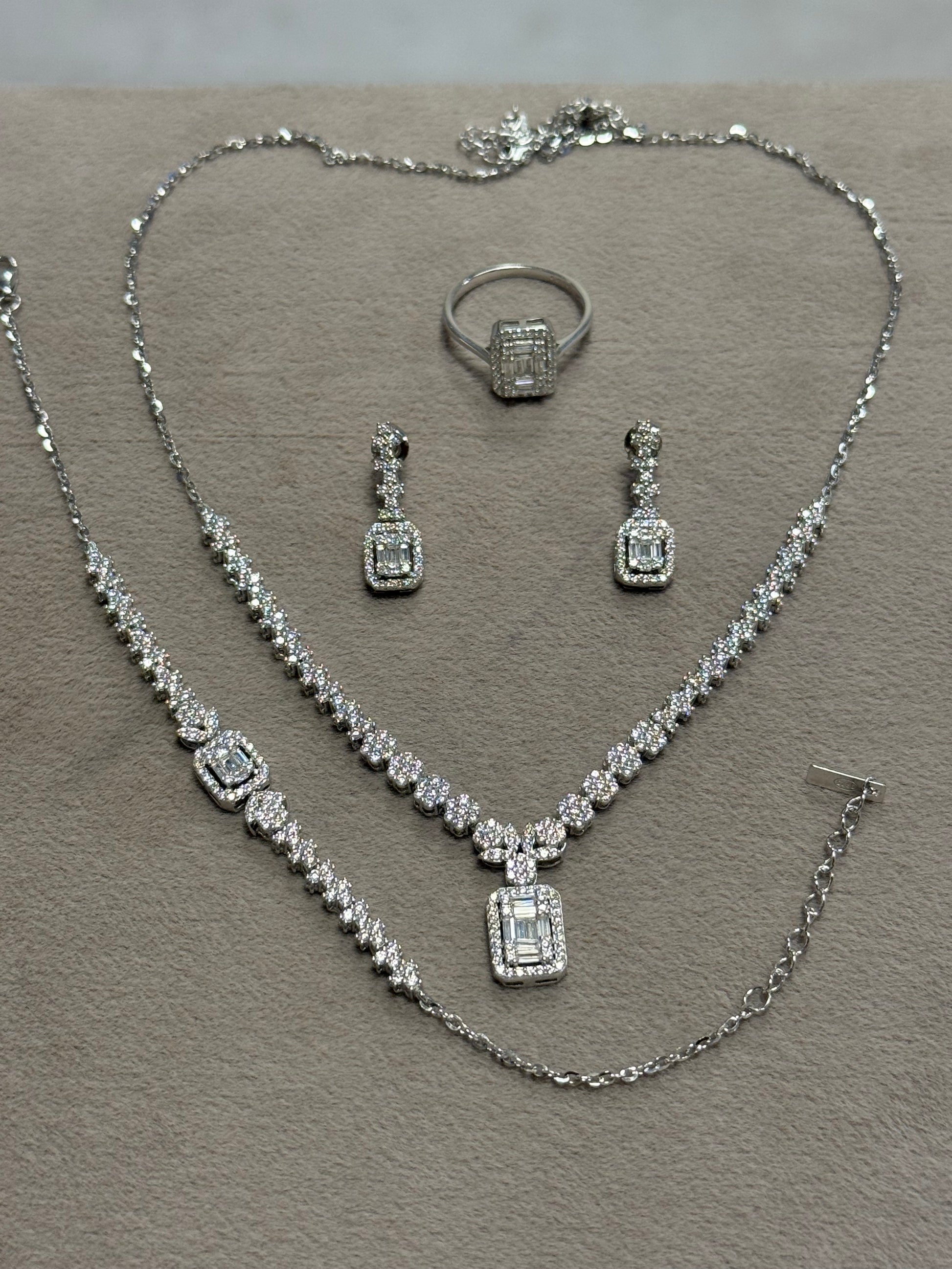 A complete, rhodium-plated 925 silver collection featuring a necklace, matching tops (earrings), ring, and bracelet. The combined weight of 18.7 grams guarantees a luxurious, quality feel.