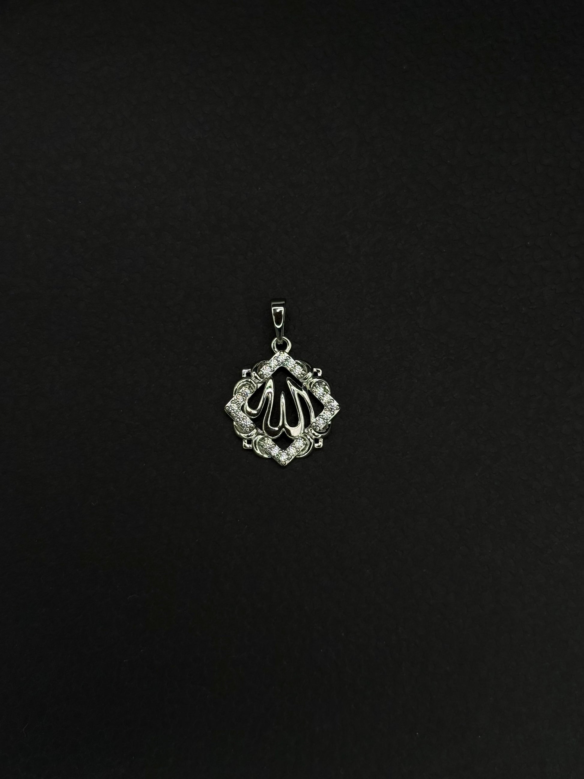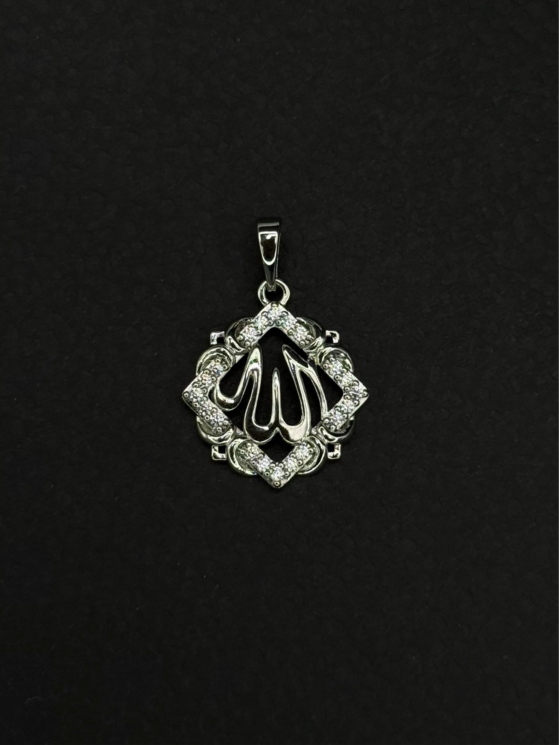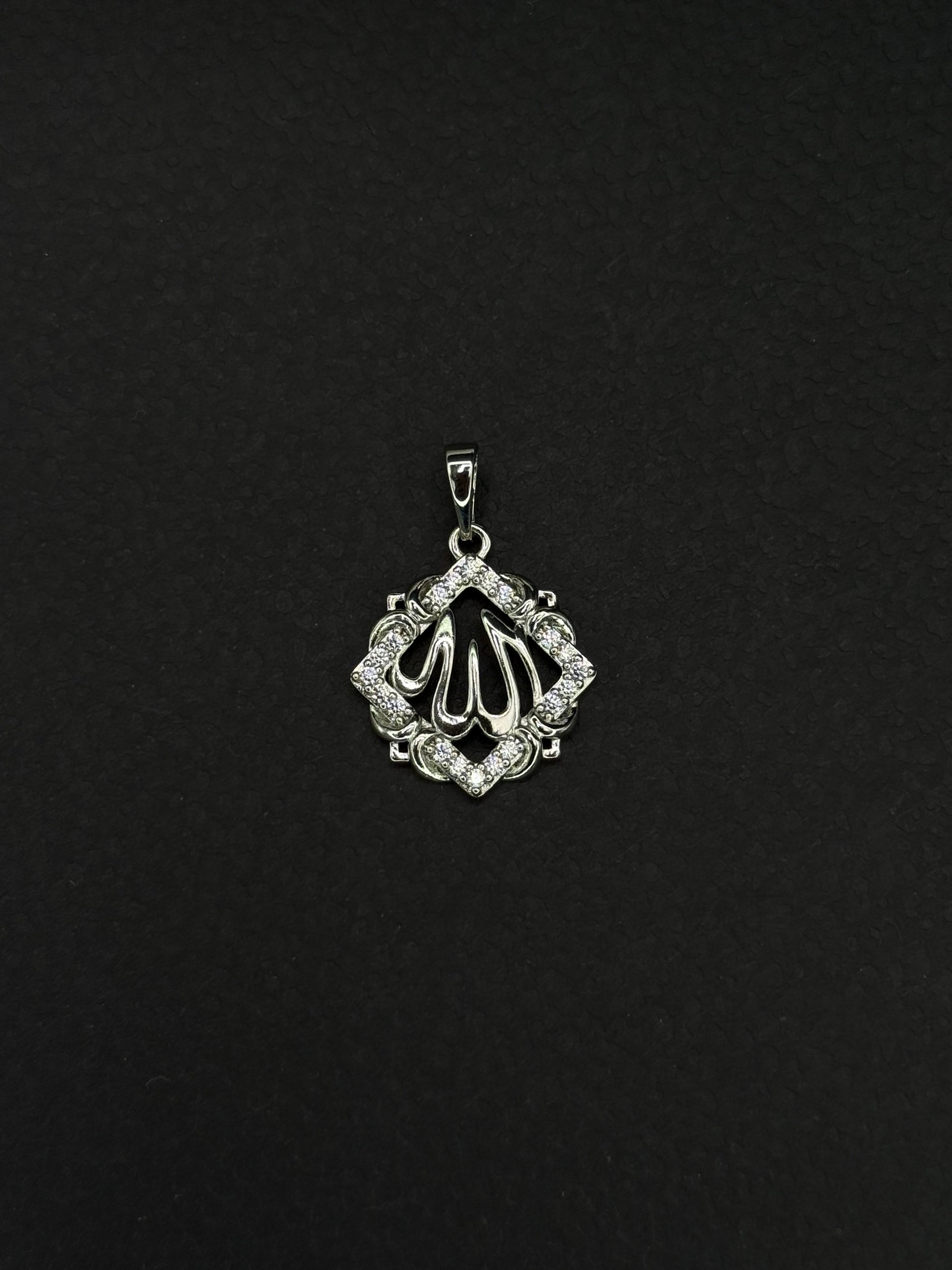 This stunning silver plated pendant features the name Allah in a bold, elegant design, framed by a diamond-shaped border with sparkling zircon stones. A beautiful expression of faith, crafted to shine with grace and meaning.
