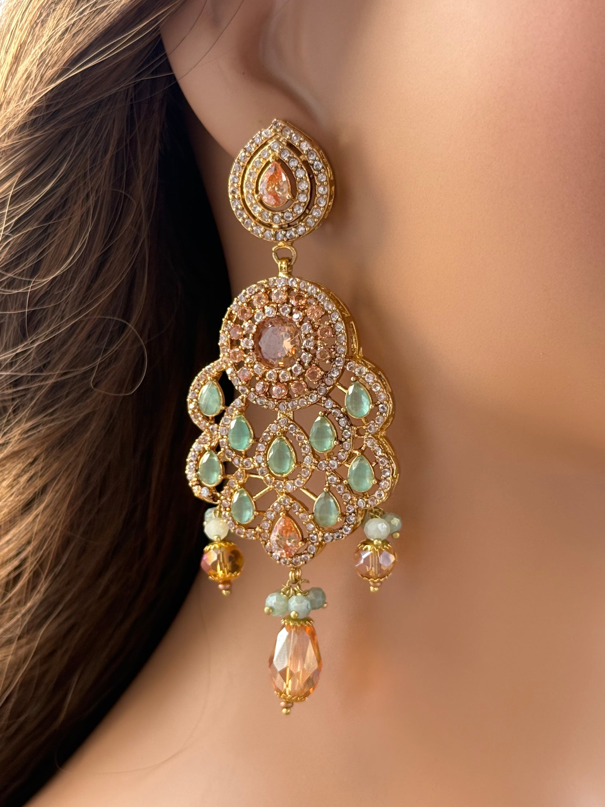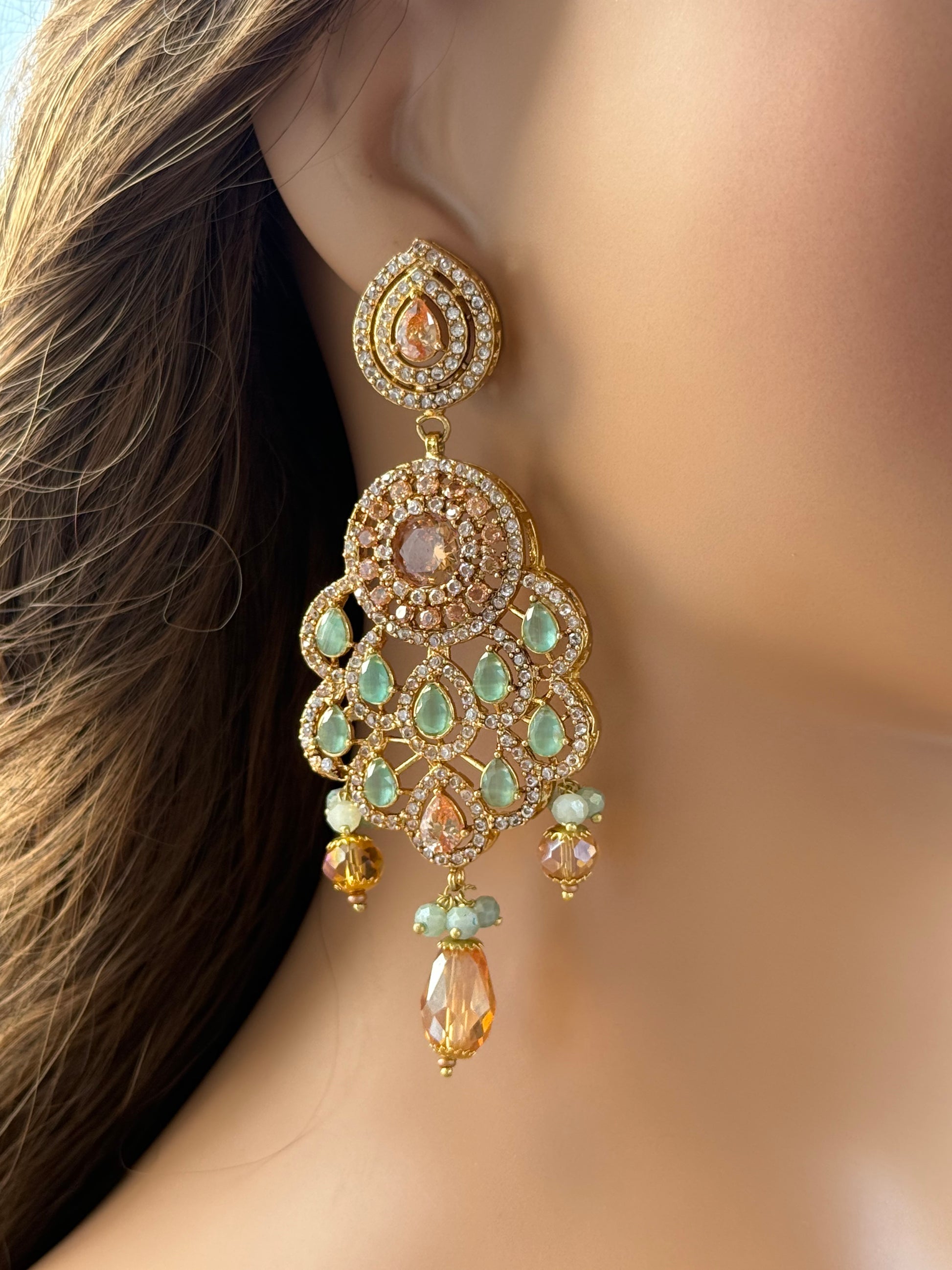 Stunning chandelier earrings featuring a blend of amber-orange and soft green stones, set in a sparkling gold frame with delicate zircon accents. Finished with faceted crystal drops, these earrings can be customized in stone shades and drop styles for a look that’s uniquely yours.