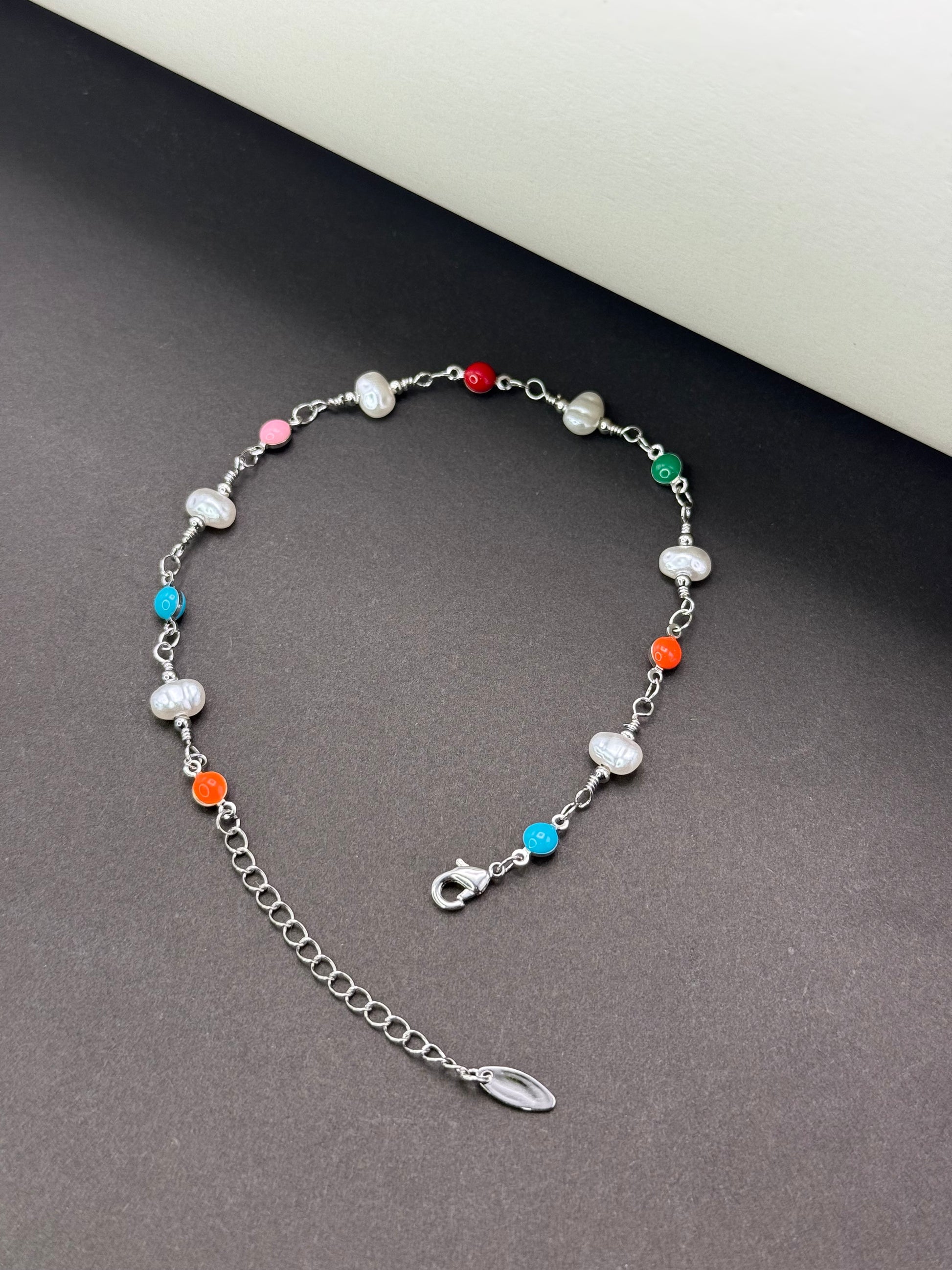 "Elegantly crafted, our silver plated multi colour pearl anklet adds a touch of timeless sophistication to any outfit."