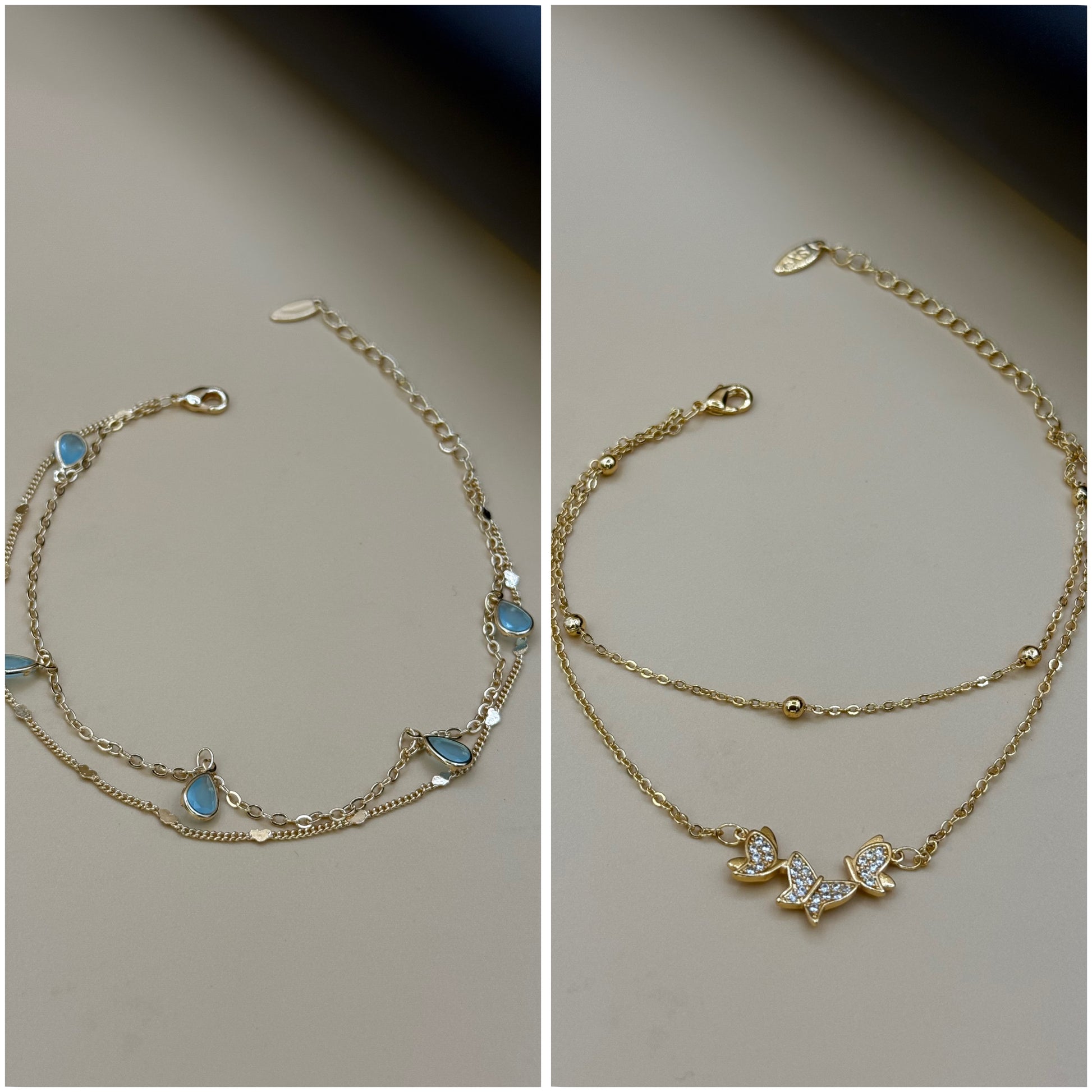 Elevate your anklet game with this elegant duo. The left design charms with soft blue teardrop pendants and a dainty black heart, perfect for a minimal yet playful vibe. The right anklet features three sparkling butterfly charms and gold bead accents, adding a touch of glam to your every step. Ideal for both casual chic and festive flair.