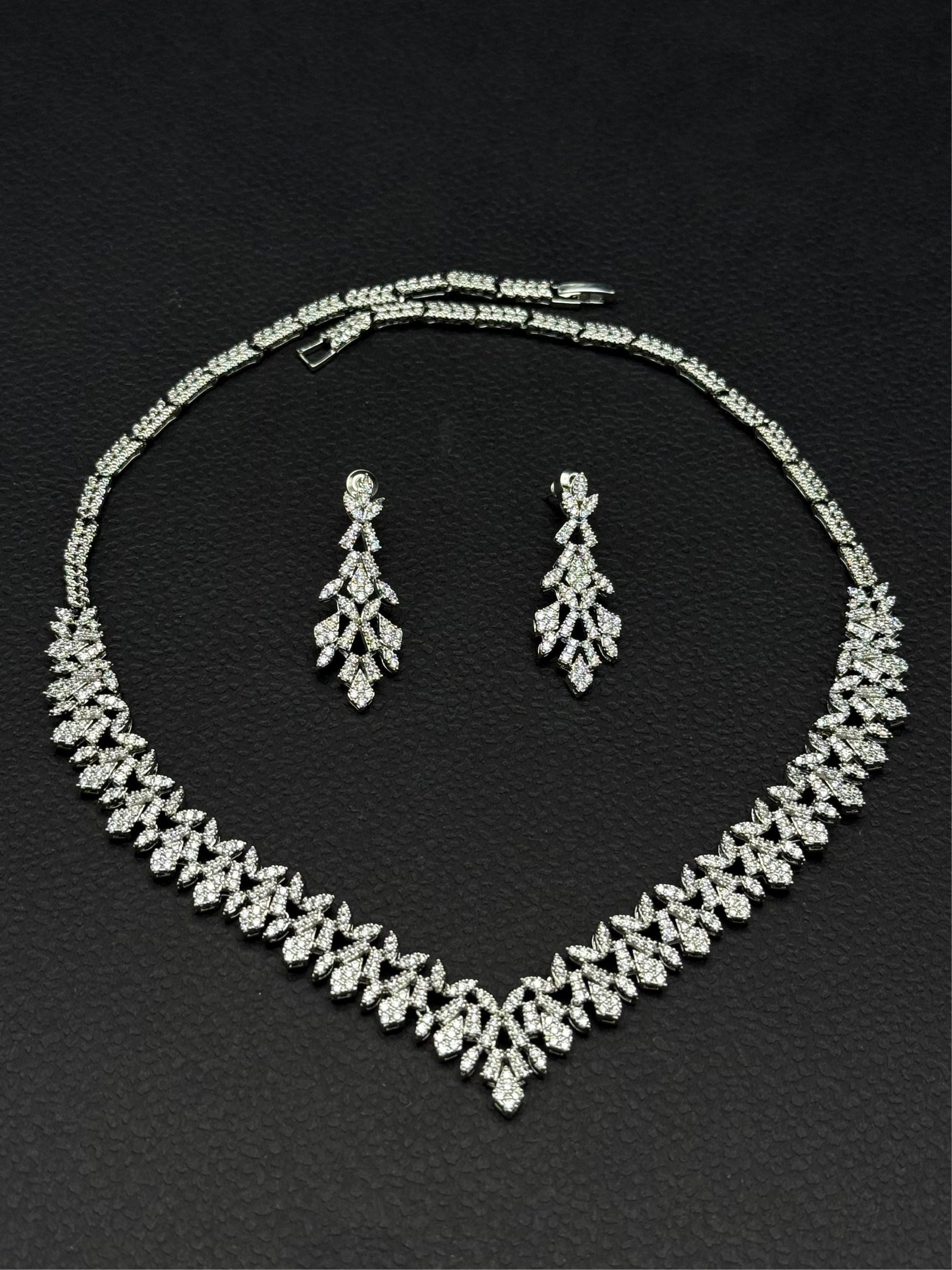 Delicately entwined like winter-kissed ivy, this shimmering set captures nature’s grace with a modern twist. A radiant cascade of stones weaves through the necklace and earrings, offering a statement of pure sophistication.