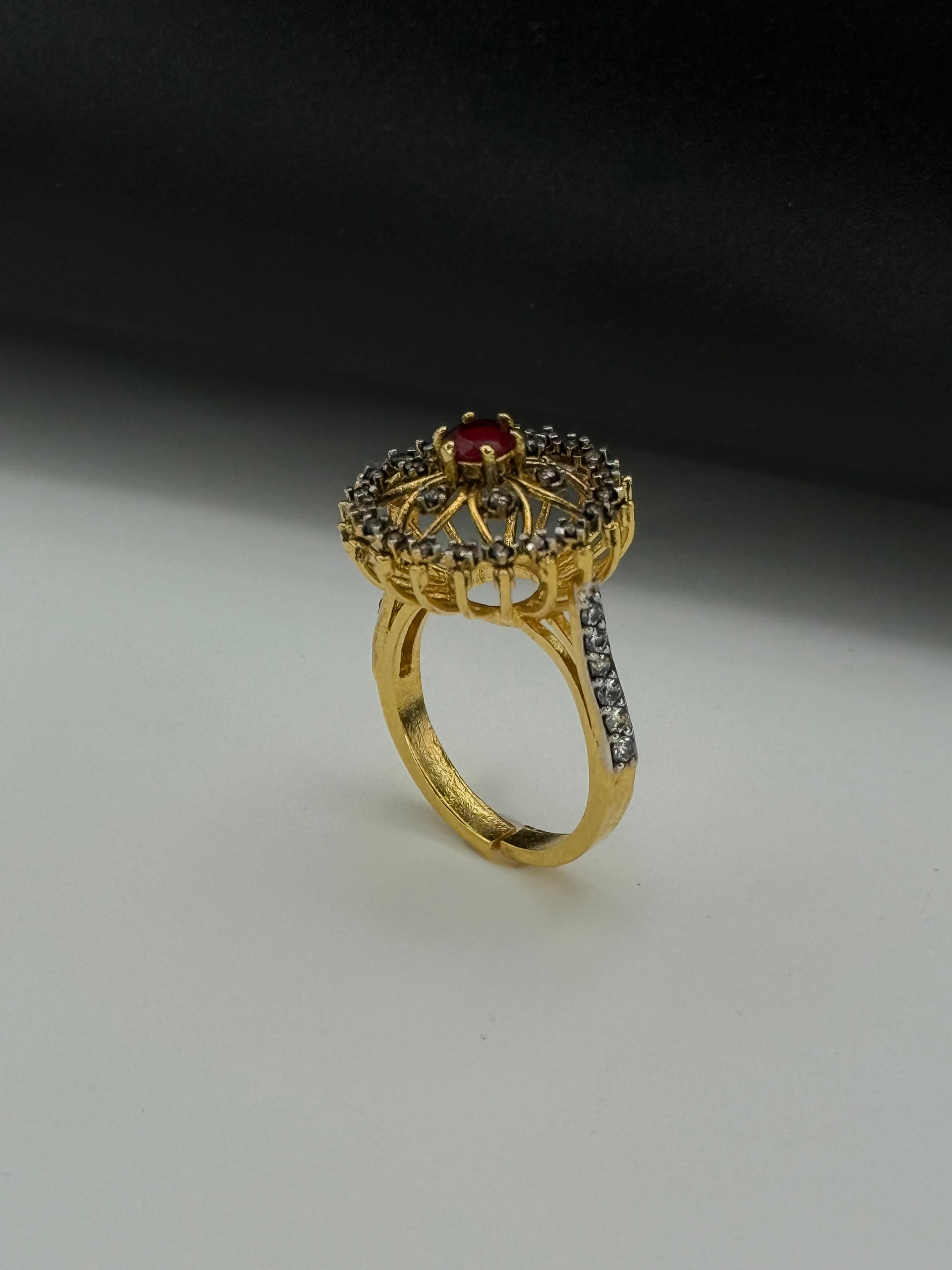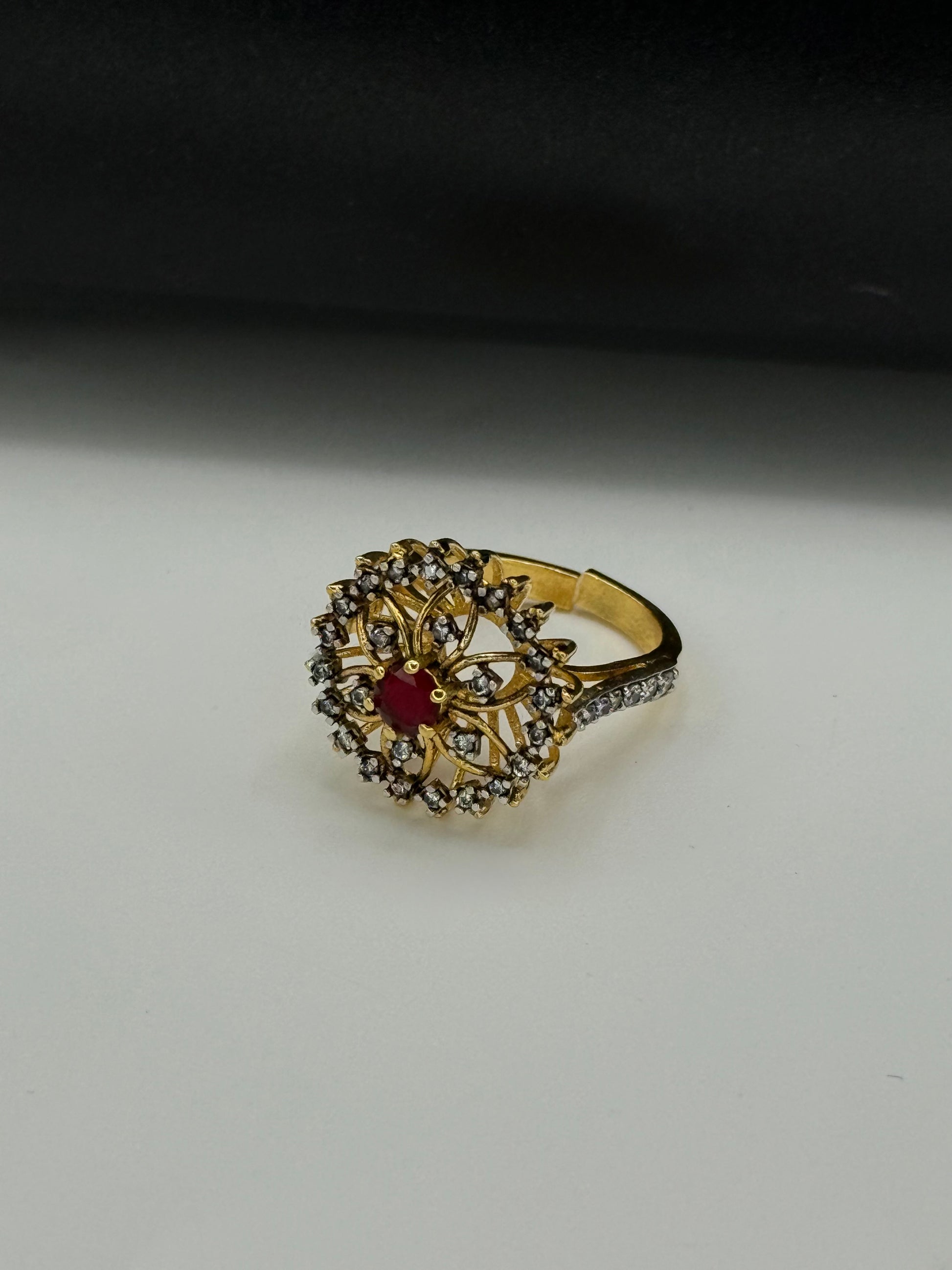 Goldplated ring with a delicate floral design, featuring a red center stone and sparkling white stones all around. A graceful piece for any special occasion.
