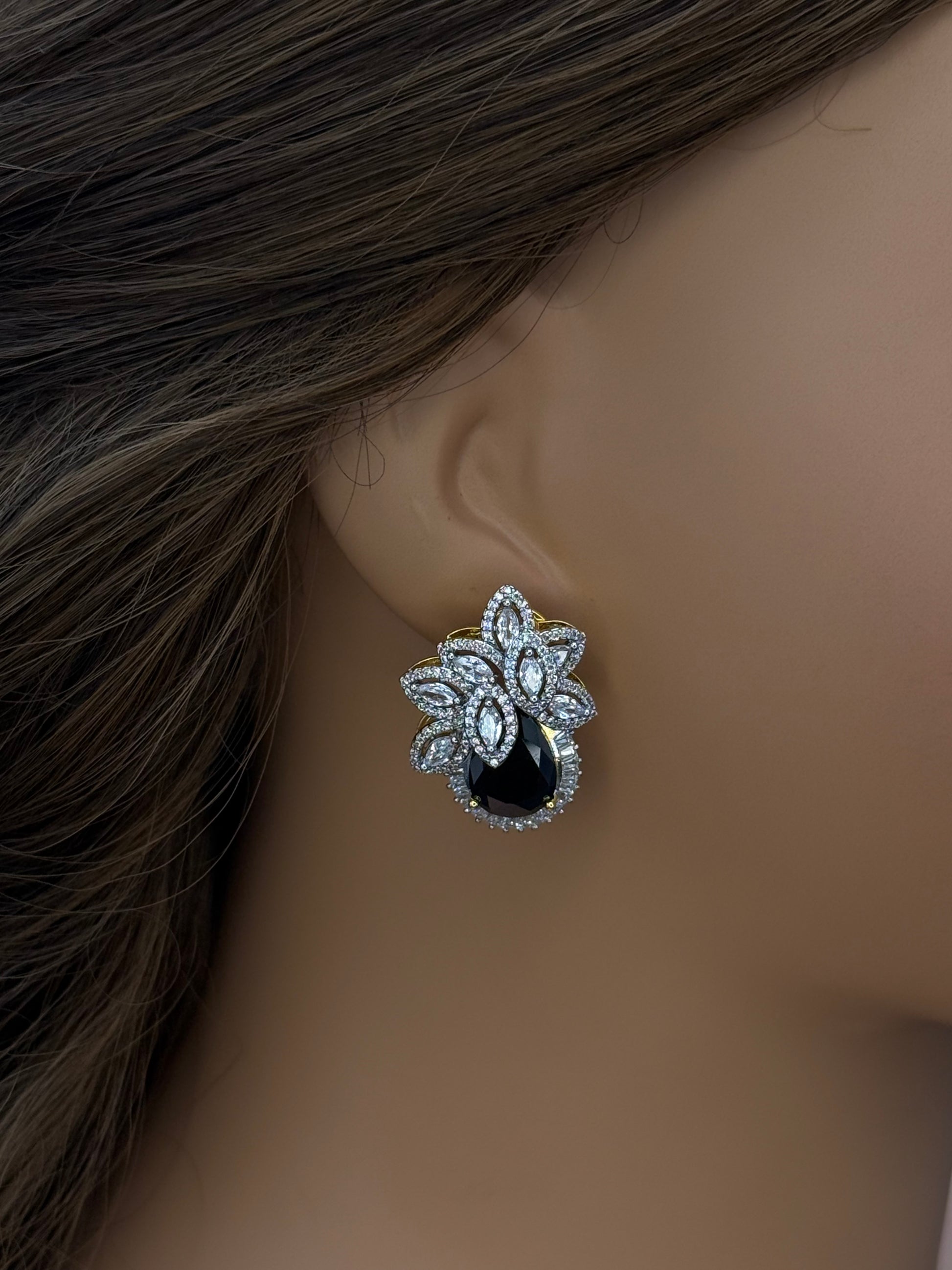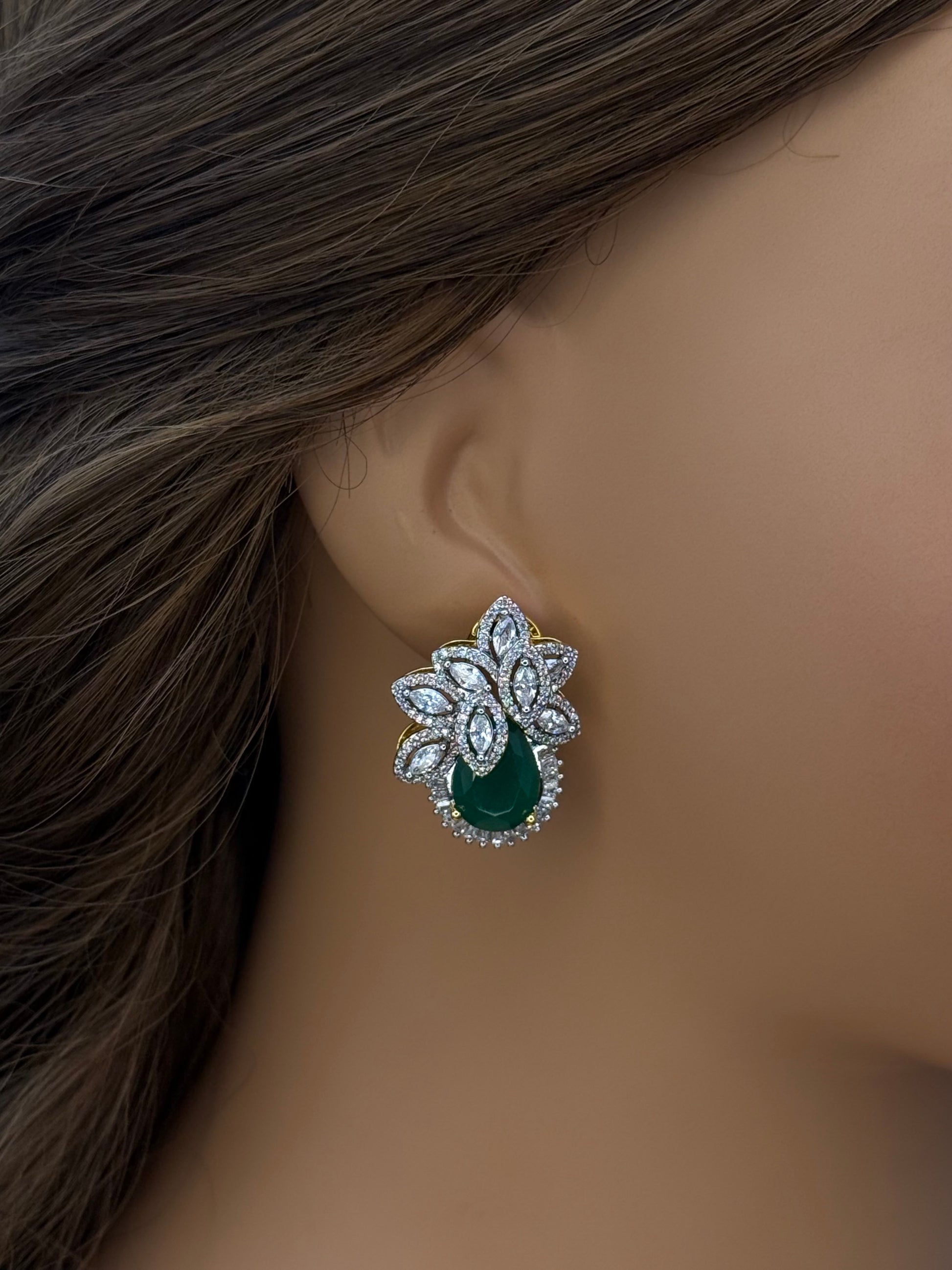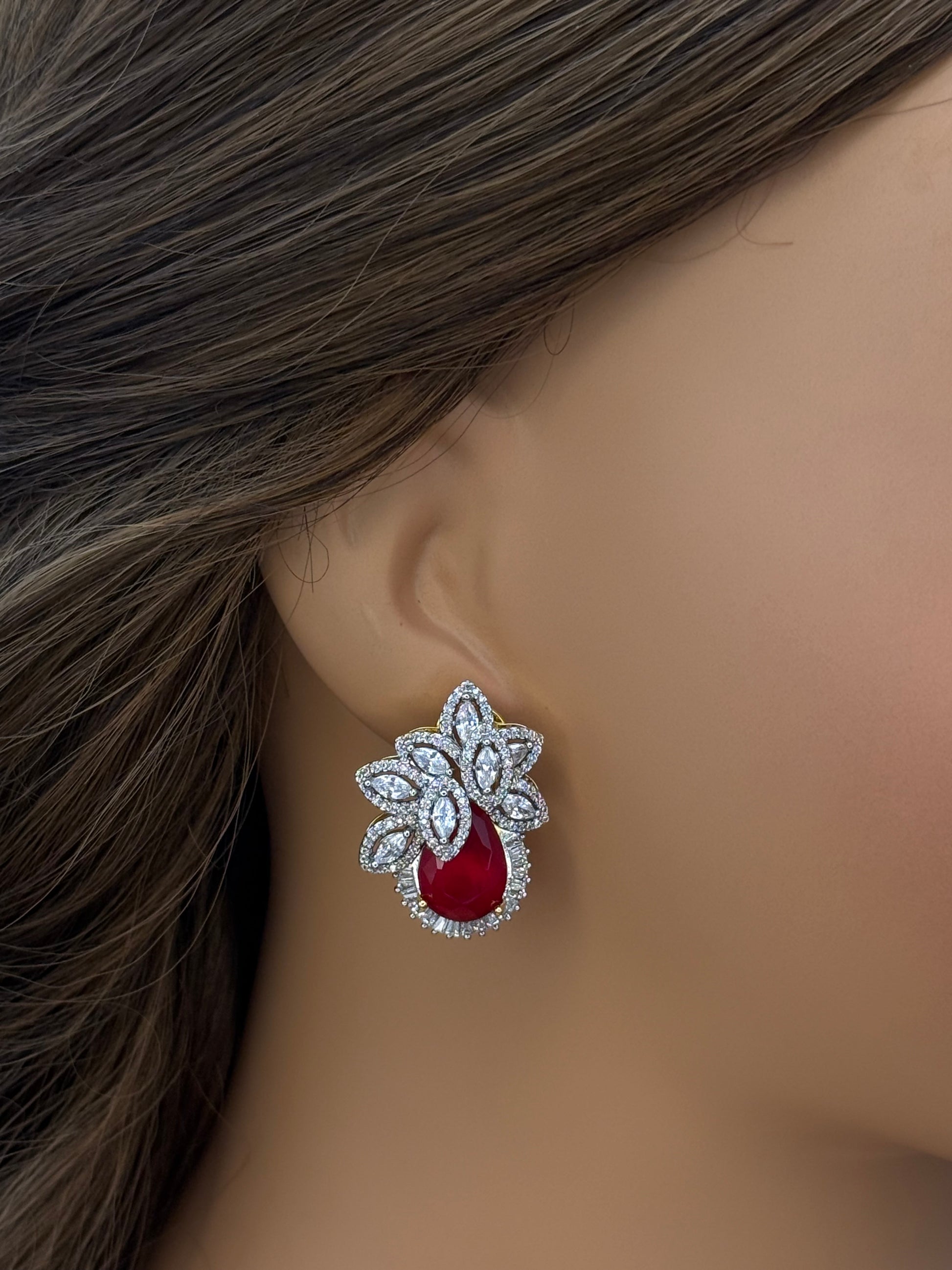 Goldplated teardrop tops adorned with marquise-cut zirconia, finished with a delicate halo of baguette stones. Elegant and timeless — can be customized in any colour of your choice for a personalized touch.