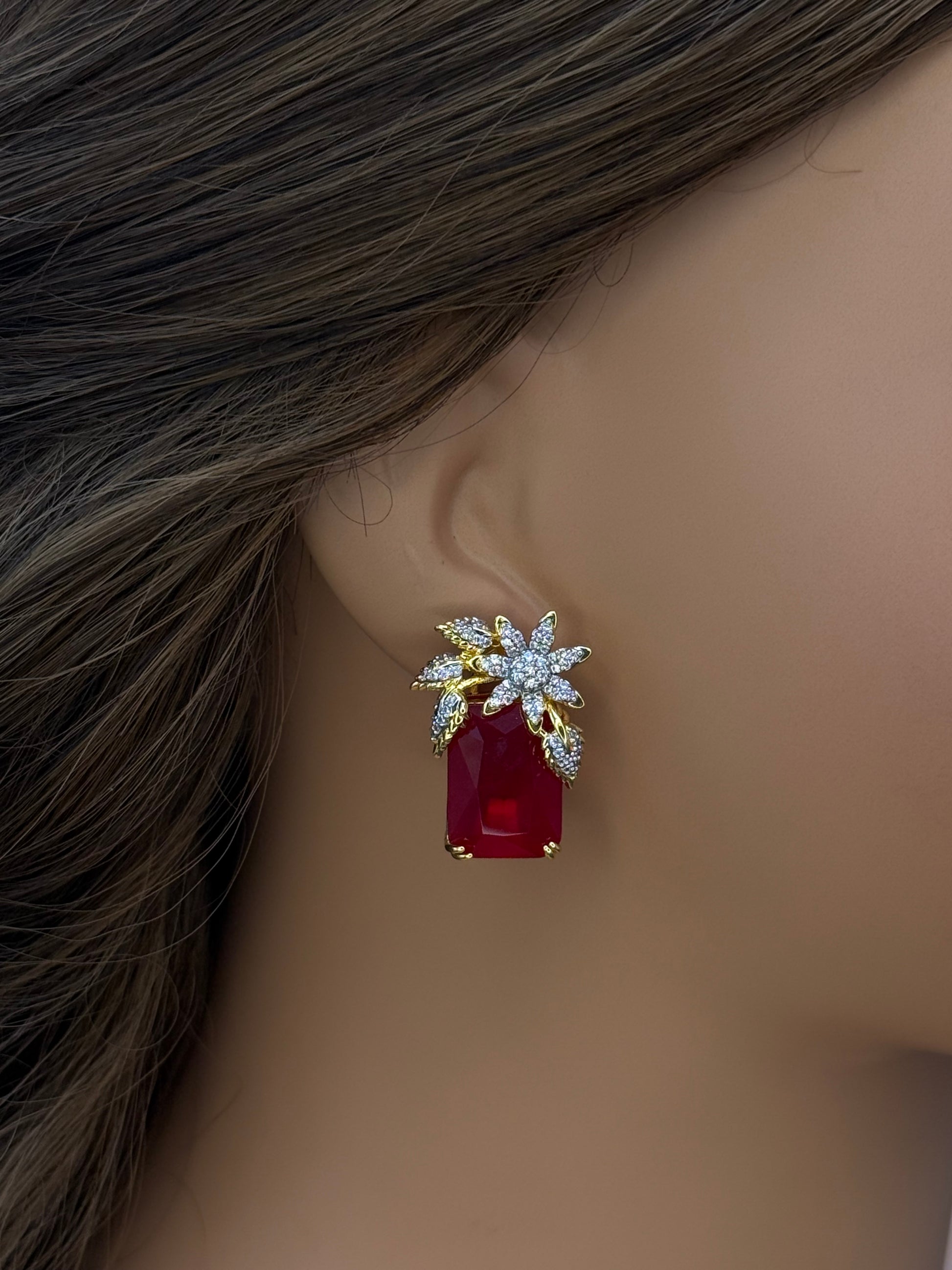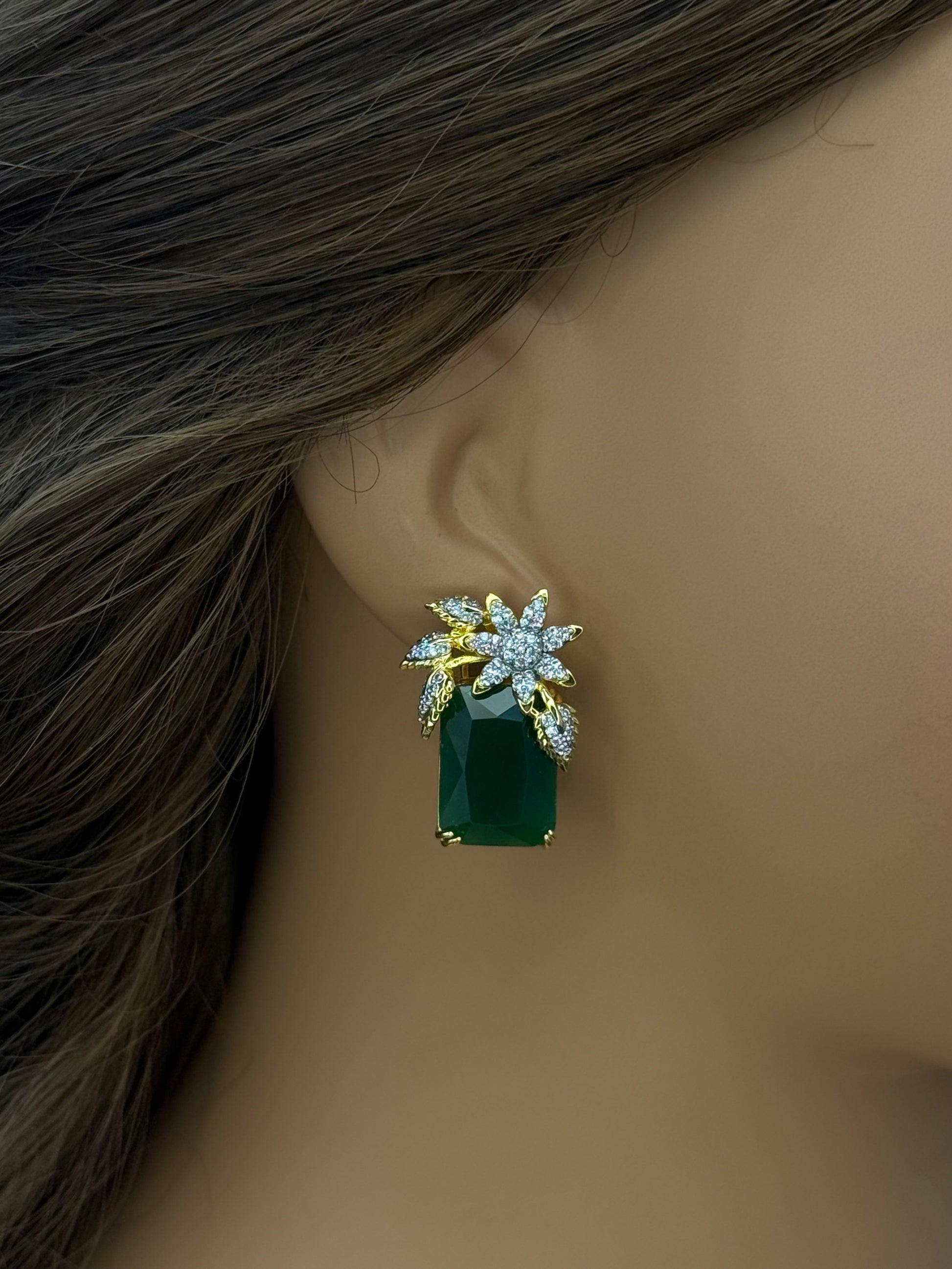 Bold and beautiful — Goldplated floral-top earrings with a striking black rectangular stone. Customizable in any colour to match your unique style.