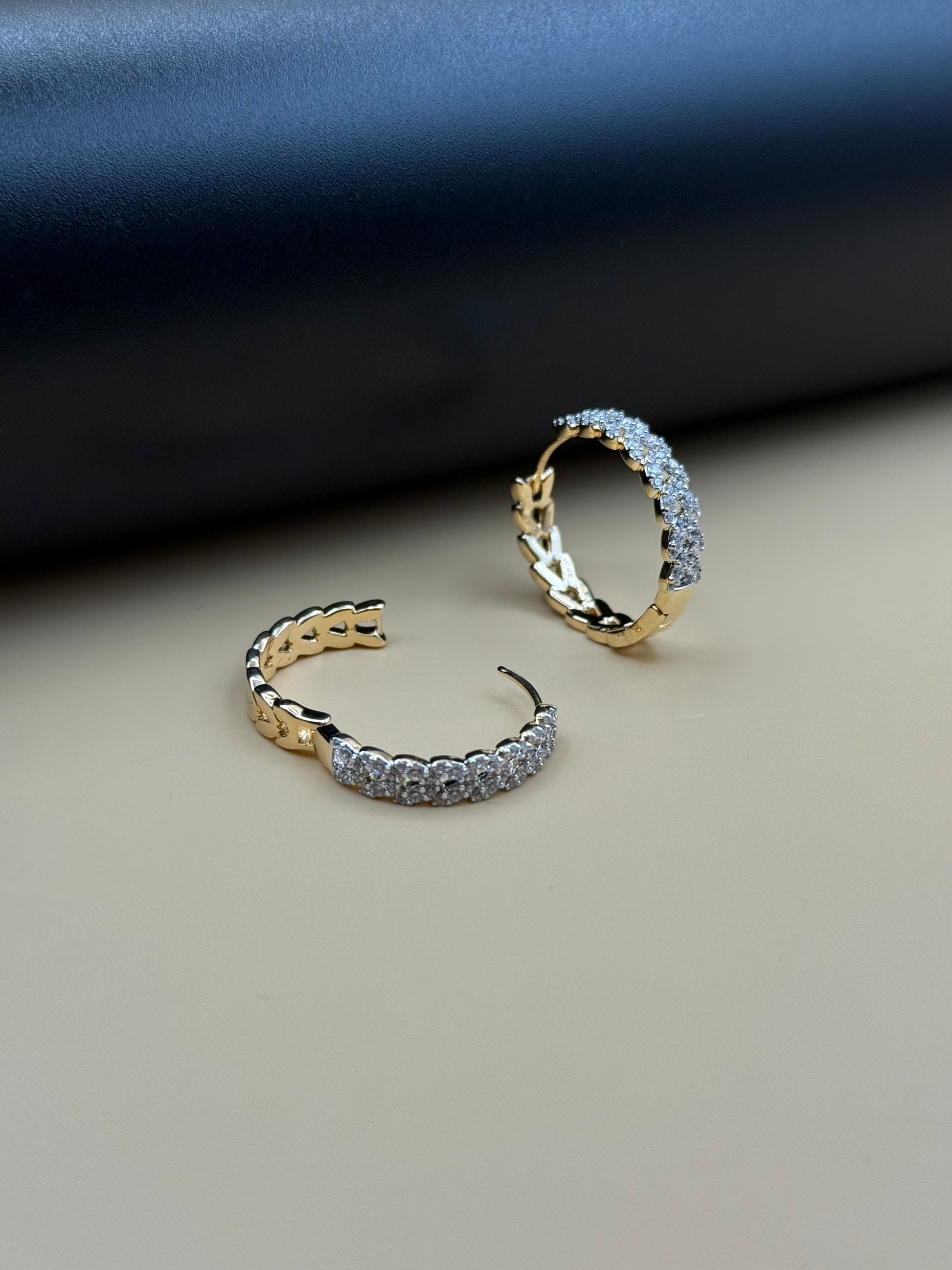 Elevate your elegance with these dazzling gold plated hoop earrings, featuring a dual design of shimmering white zircon stones on the front and intricate laurel leaf details on the back. Perfect for everyday luxury or special occasions.