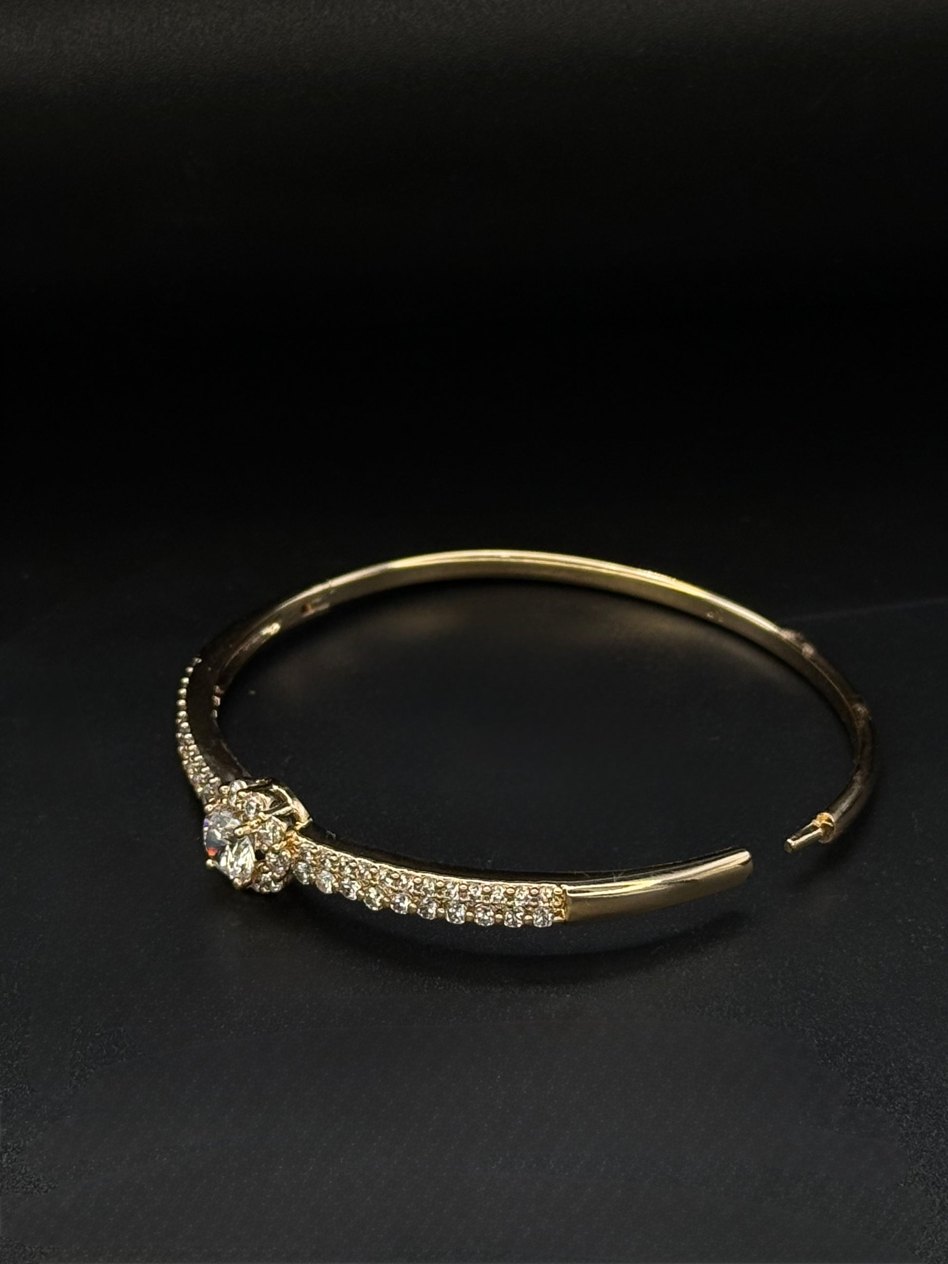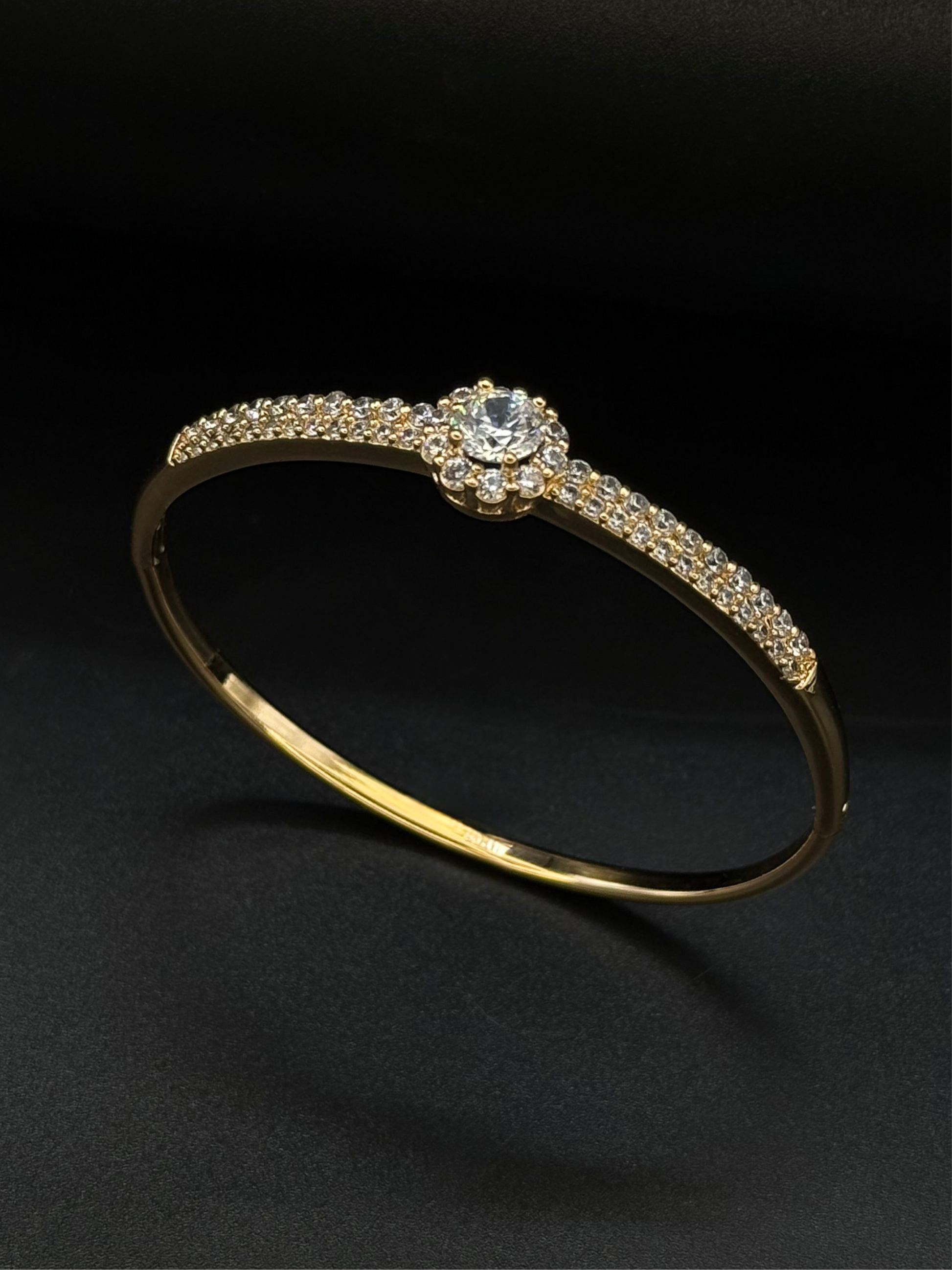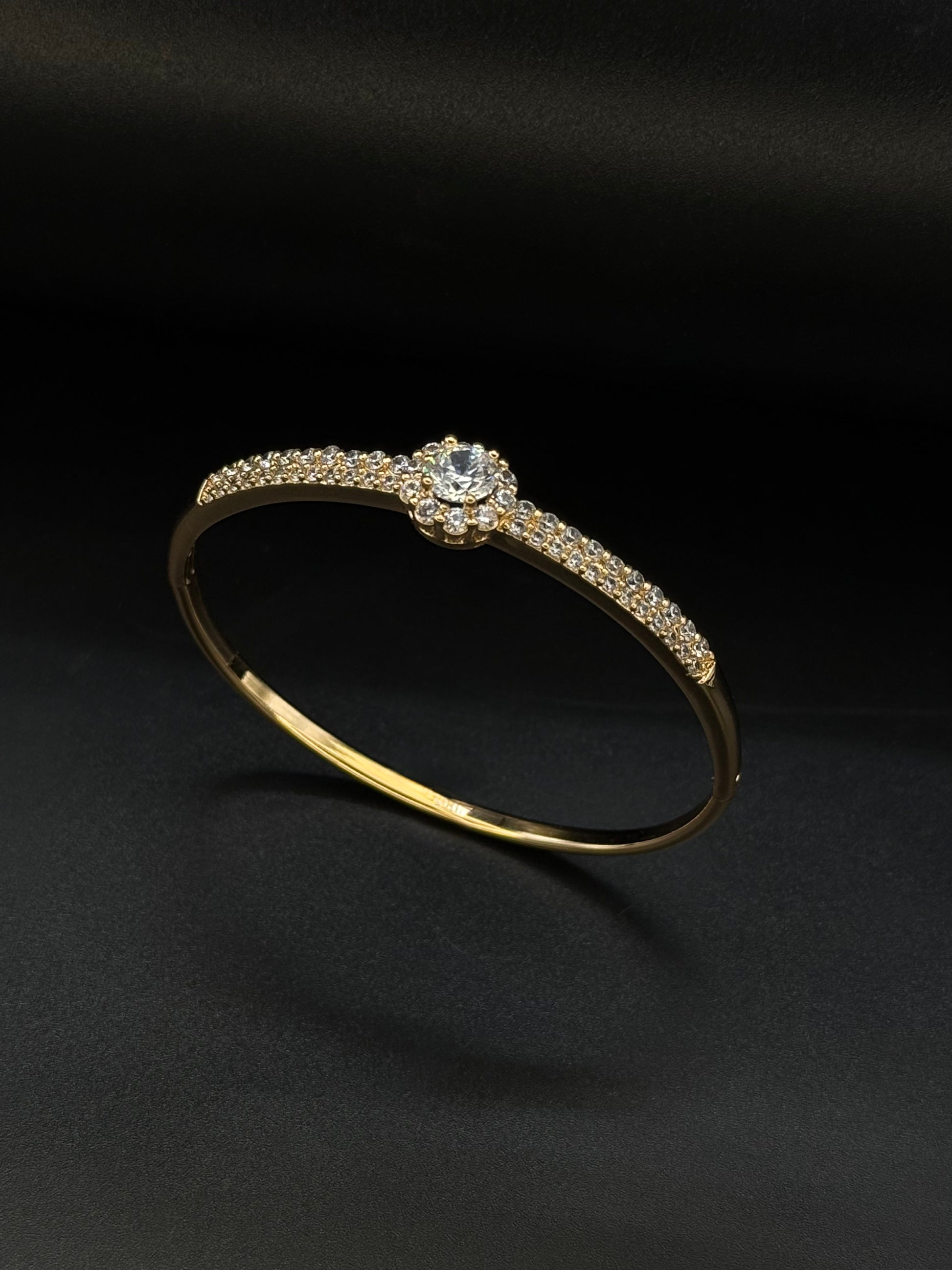 This elegant gold-plated bangle showcases a dazzling solitaire-style zircon centerpiece surrounded by a halo of sparkling stones. A timeless floral-inspired design that radiates charm and sophistication.