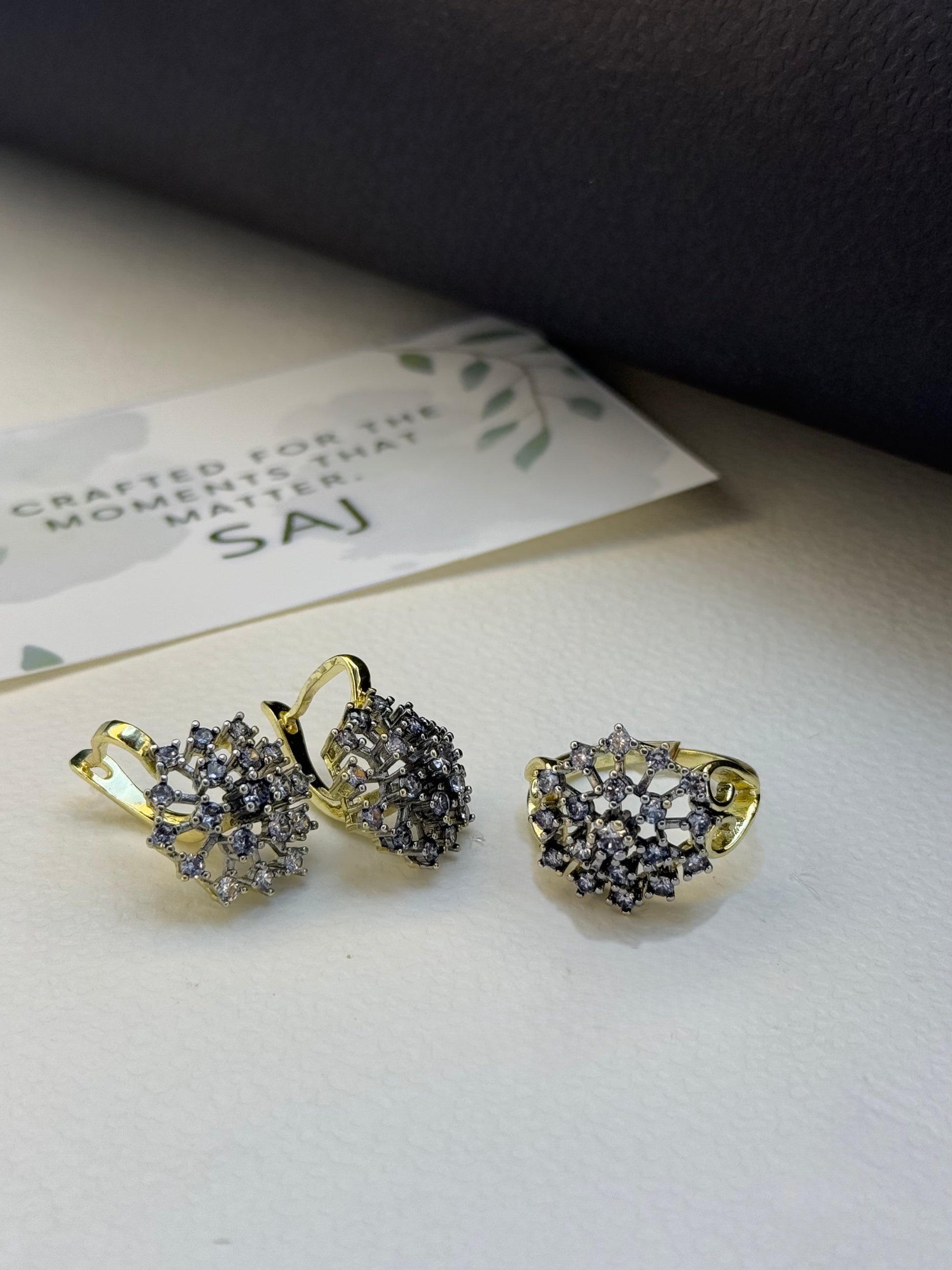 Light up every moment with the Radiant Charm Set. Featuring a stunning pair of gold-plated earrings and a beautifully coordinated ring, this set is designed to add a touch of brilliance to your style. With its sleek lines and luminous finish, each piece radiates elegance and confidence. Whether you’re dressing up for a special event or adding a little sparkle to your everyday look, the Radiant Charm Set is your perfect companion.