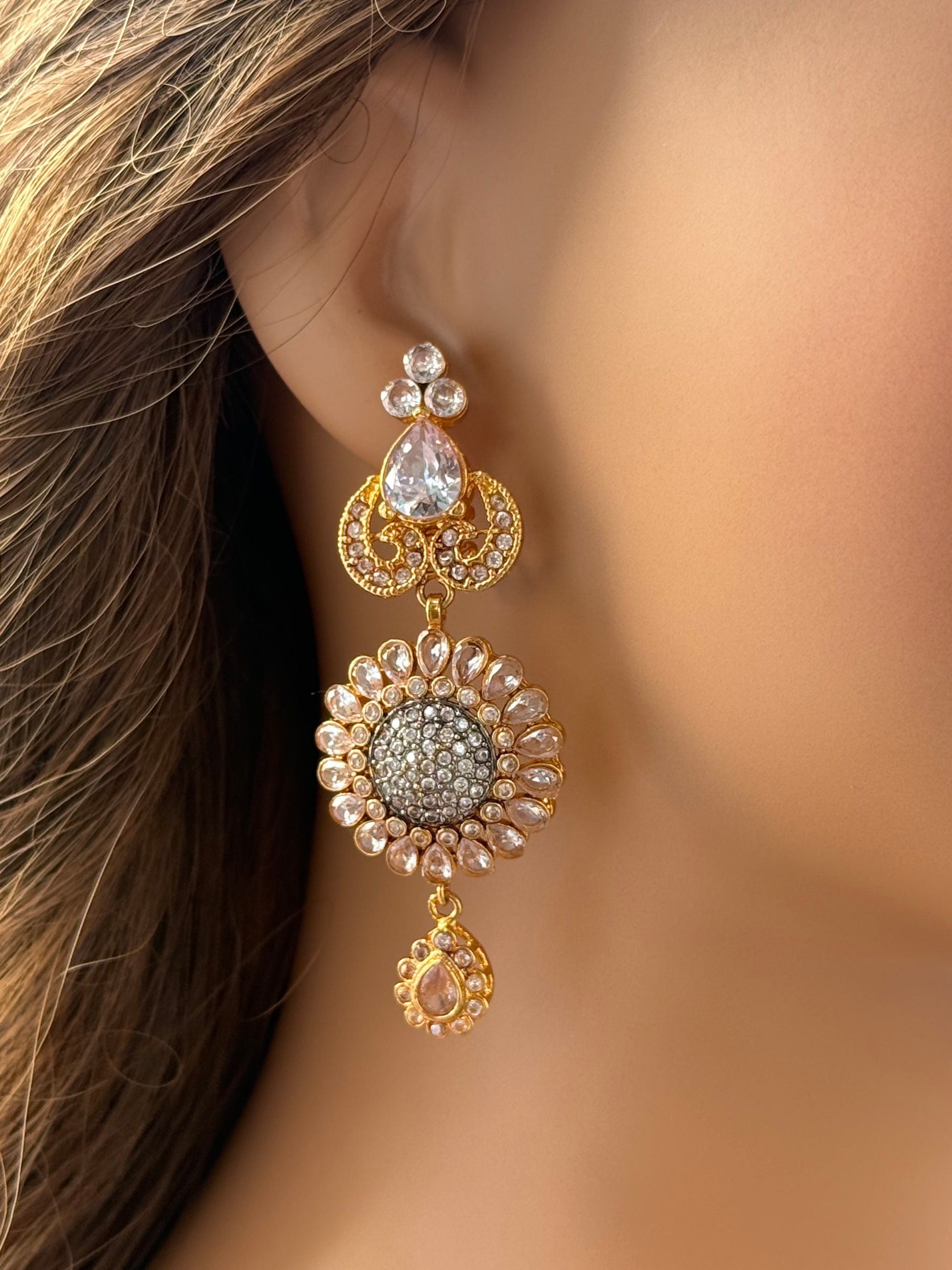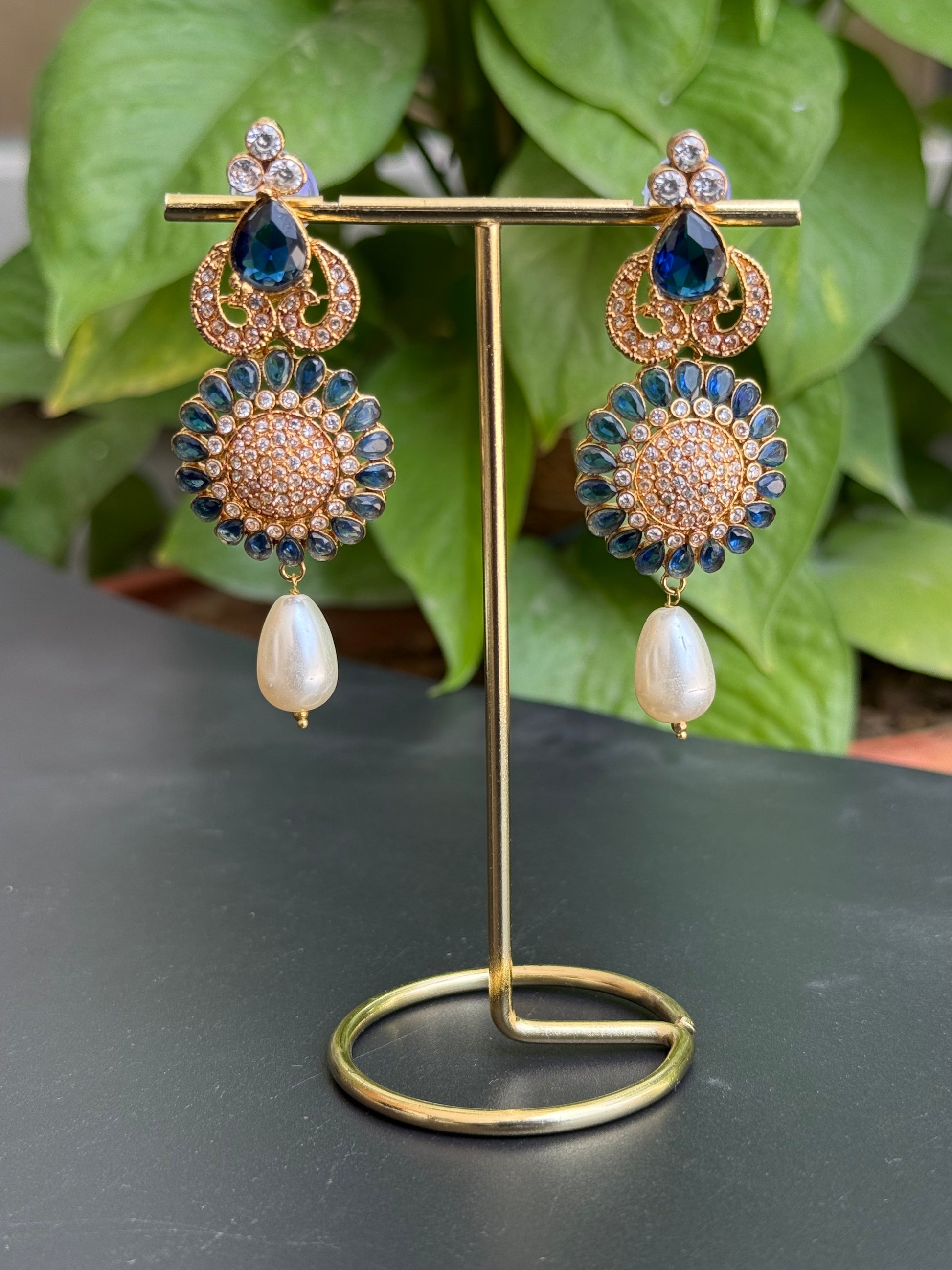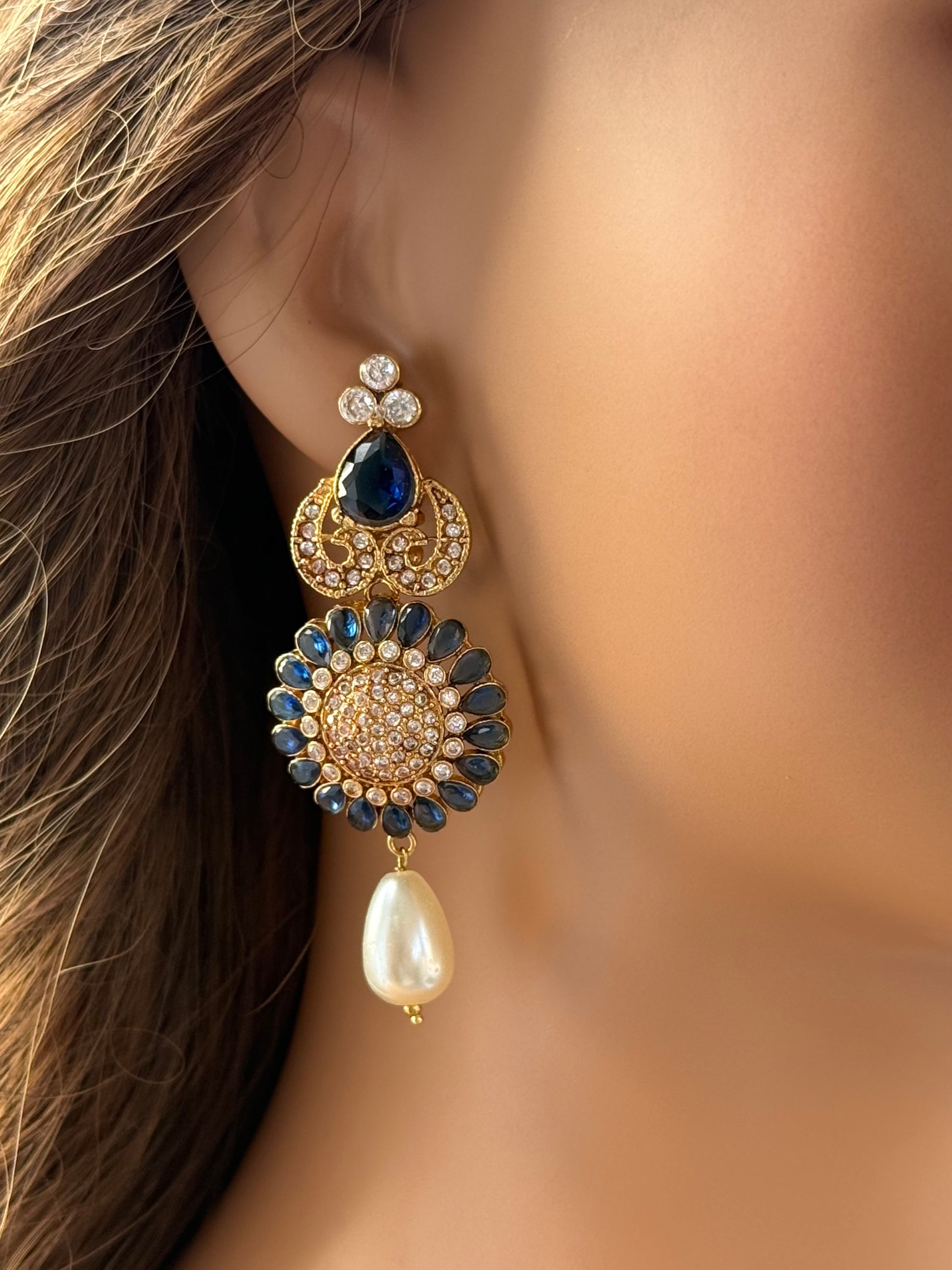 Elegant earrings featuring a sparkling floral center surrounded by teardrop stones and finished with graceful dangling drops. Available in soft pastel tones and deep sapphire hues, these beauties can be customized in stone colors and drop designs to match your style.