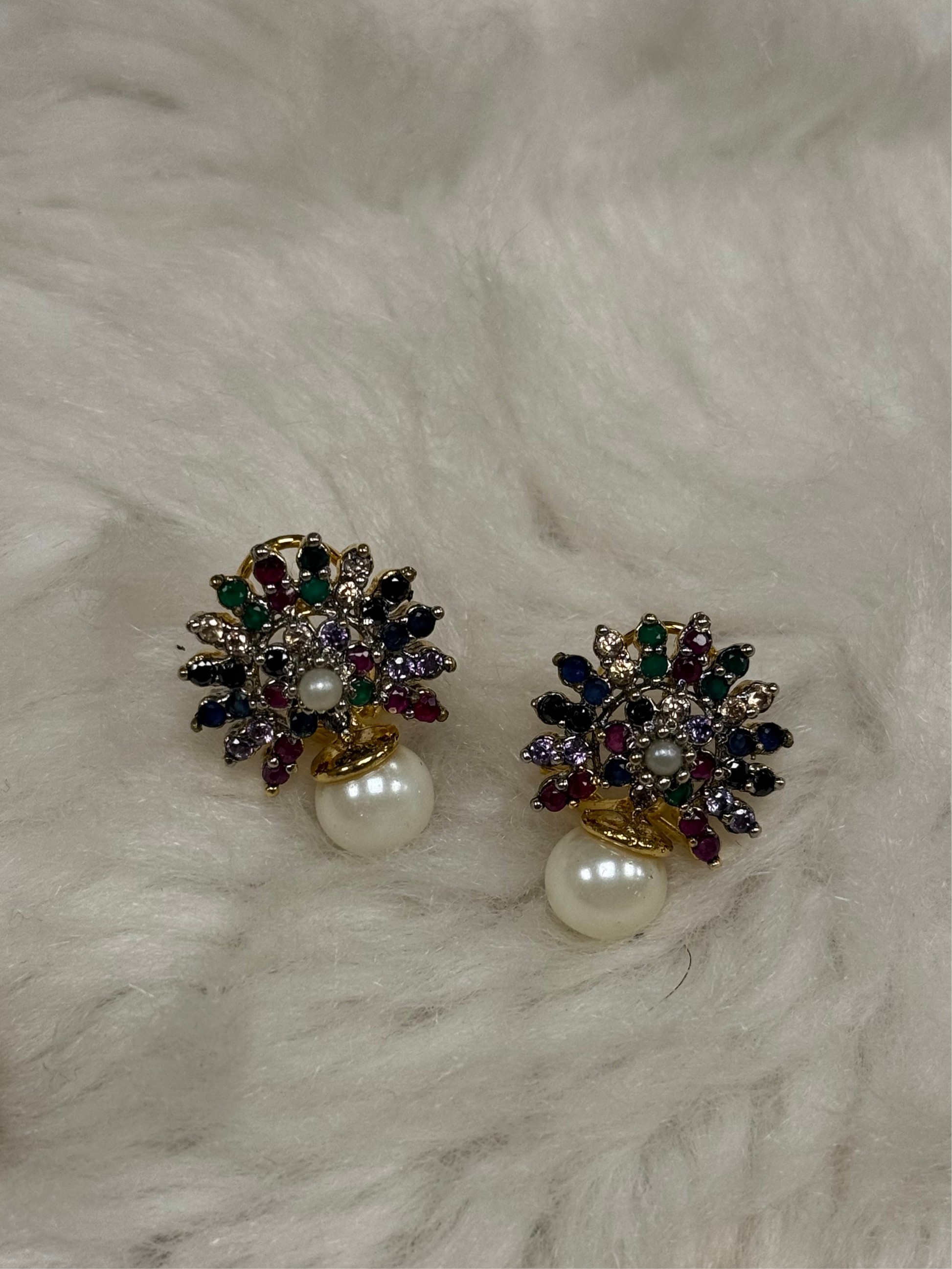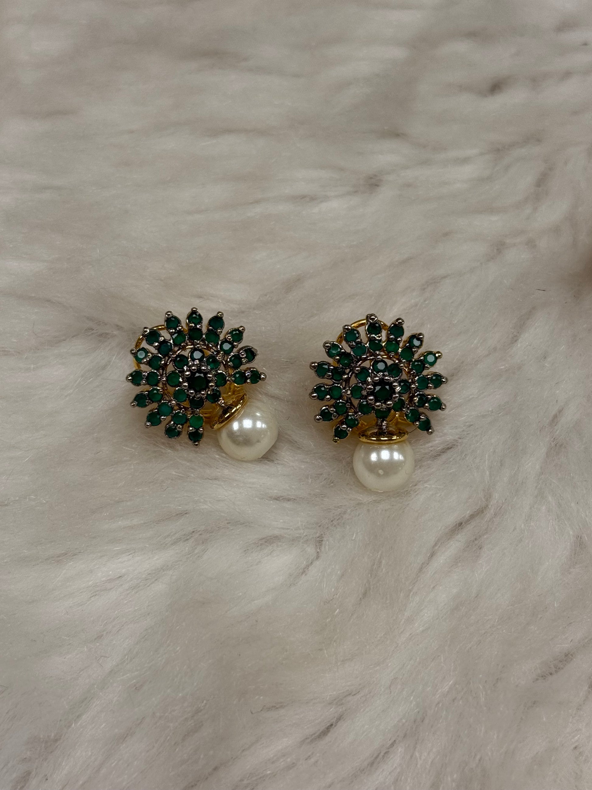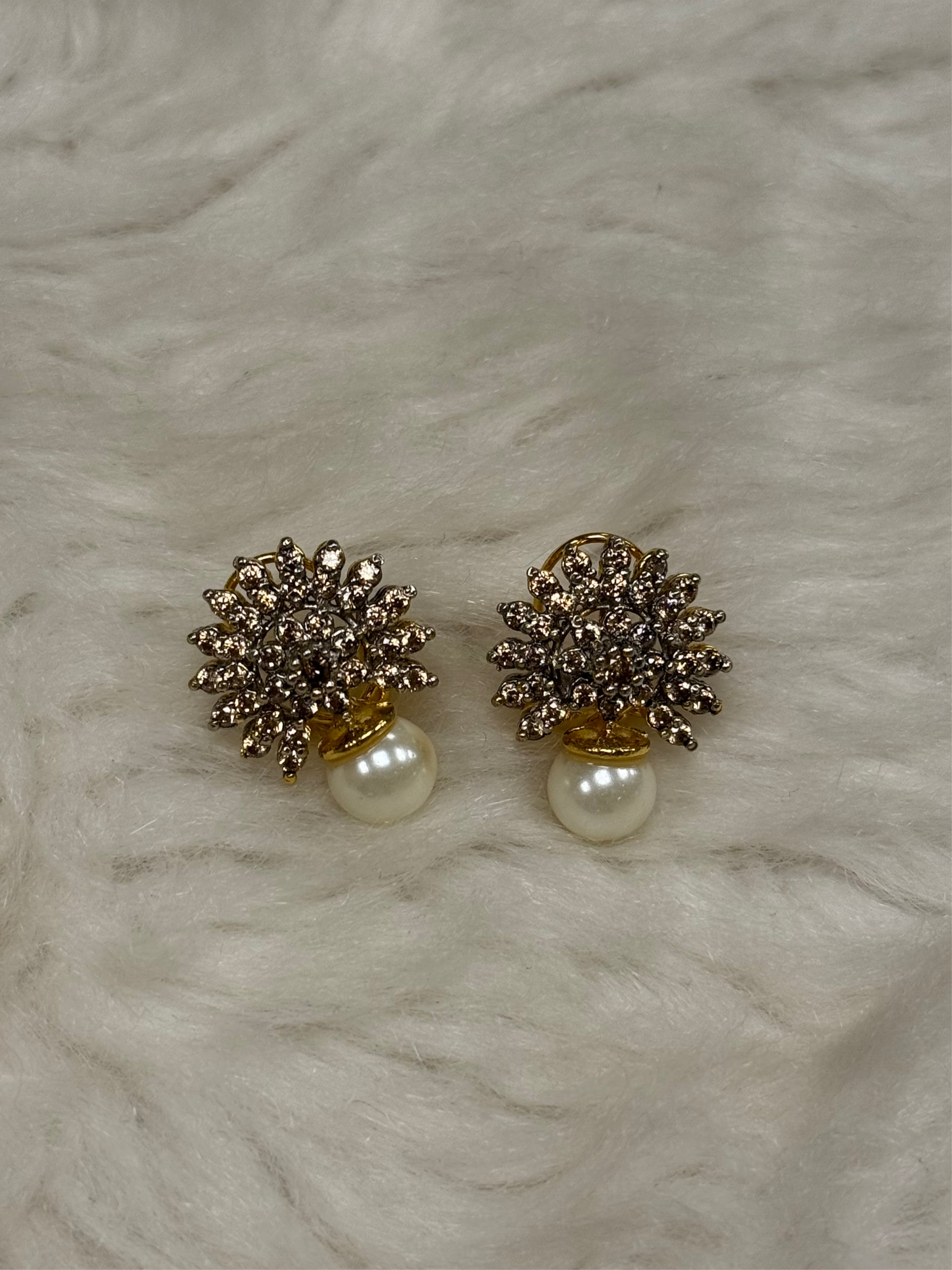 Elegant floral studs adorned with shimmering stones and a classic pearl drop for a timeless charm.