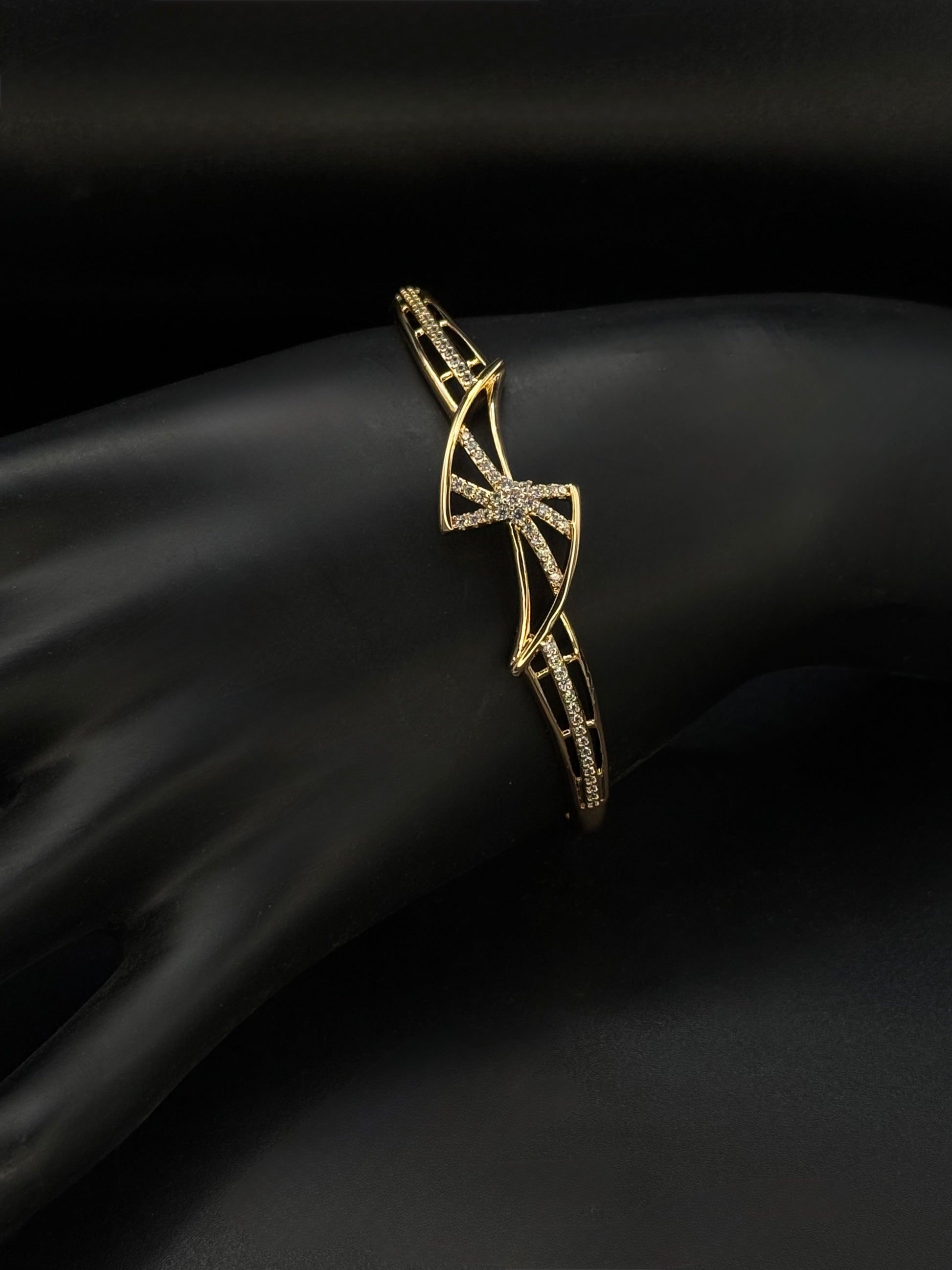 A graceful gold-plated bangle highlighted by a radiant starburst center of fine zircon stones. With flowing curves and a modern twist design, it captures elegance and brilliance in one stunning piece.