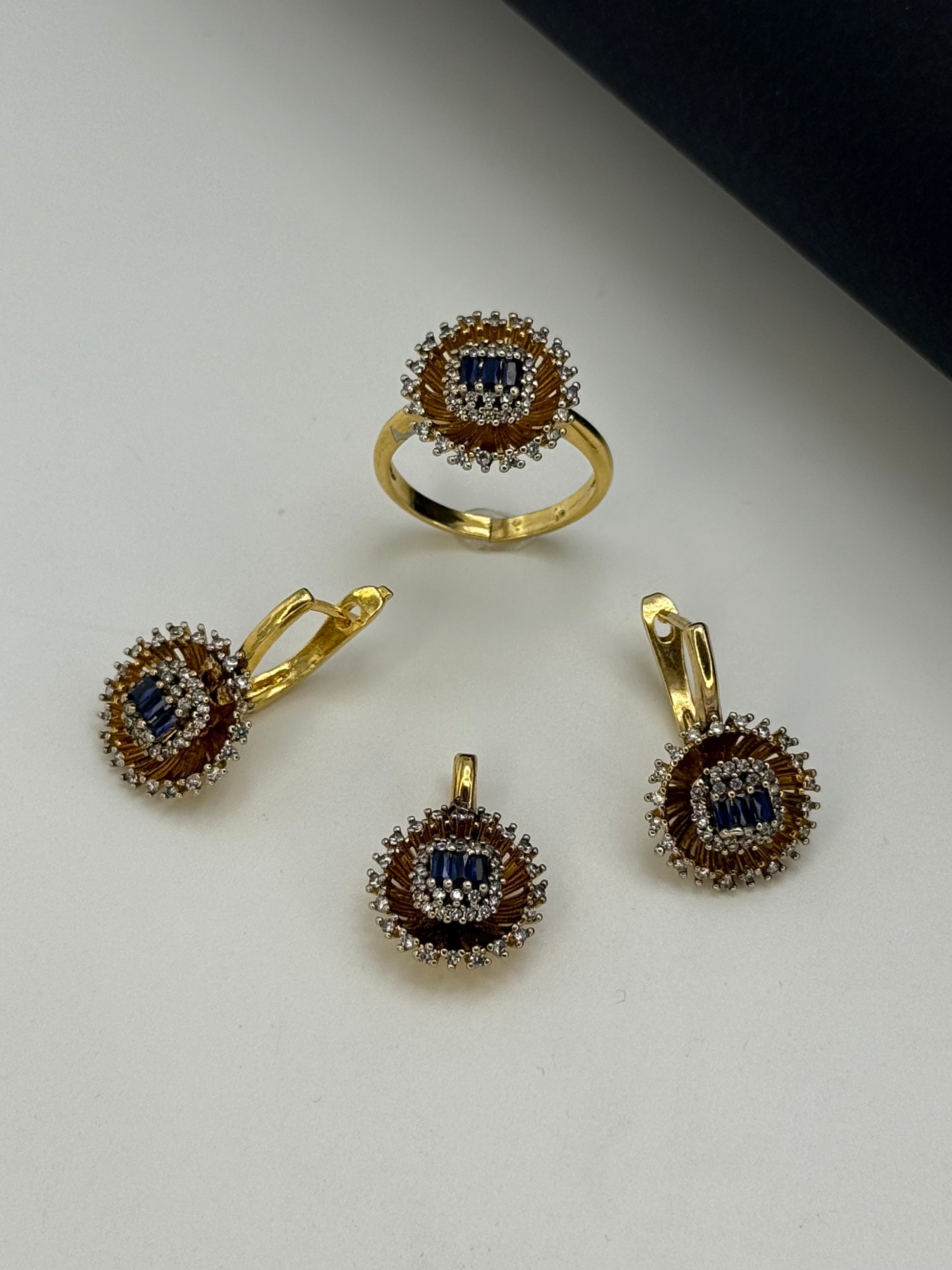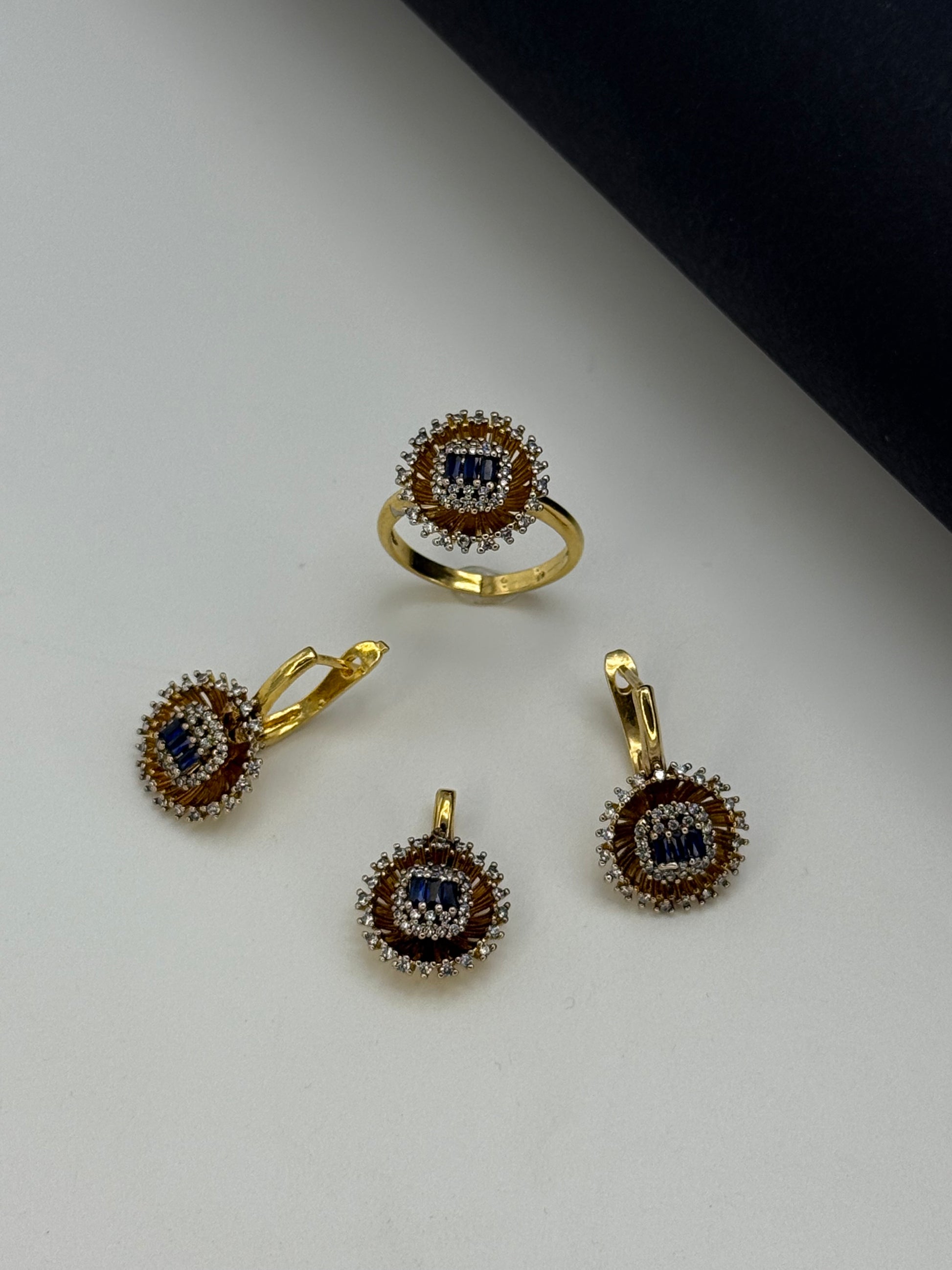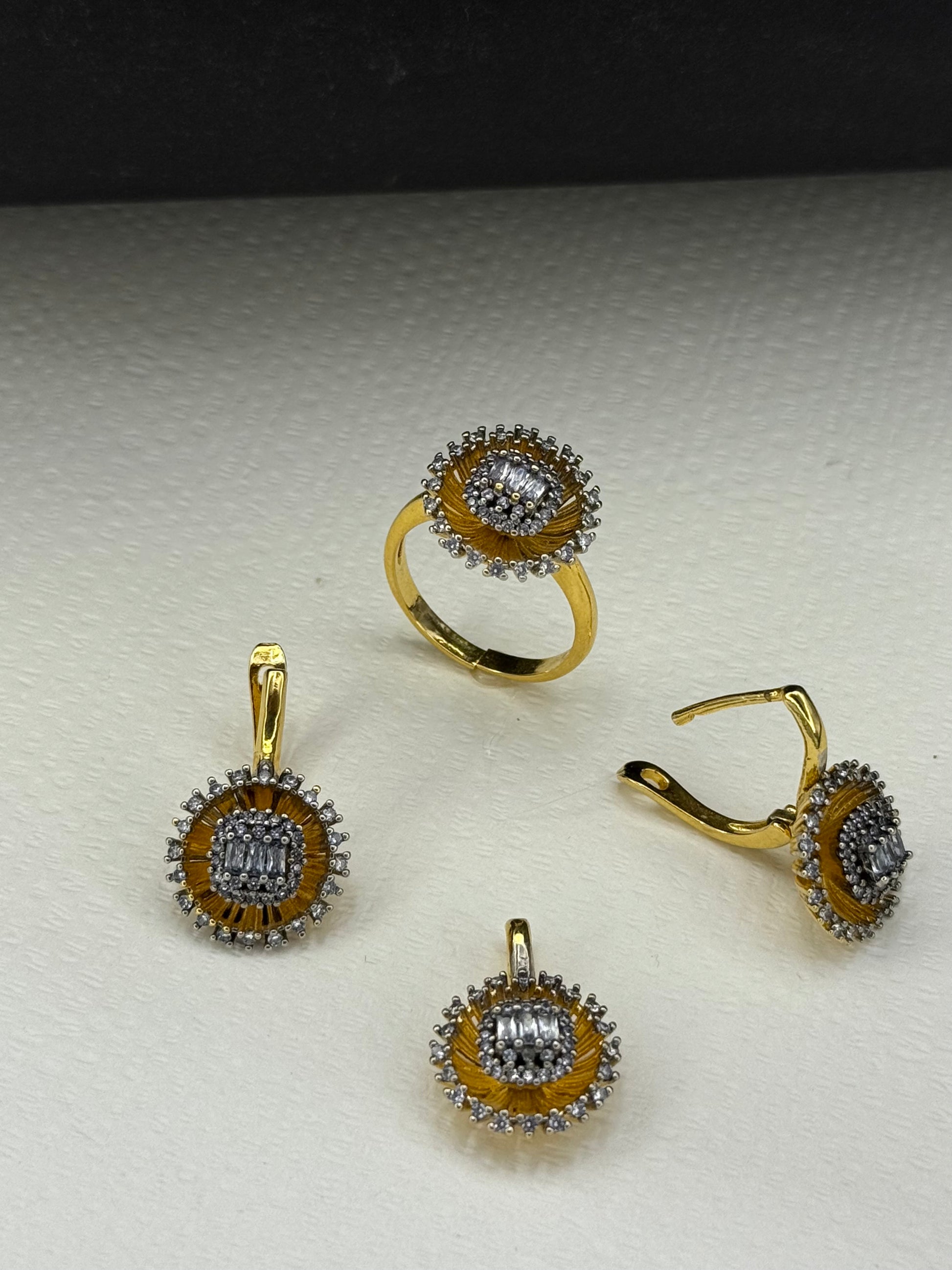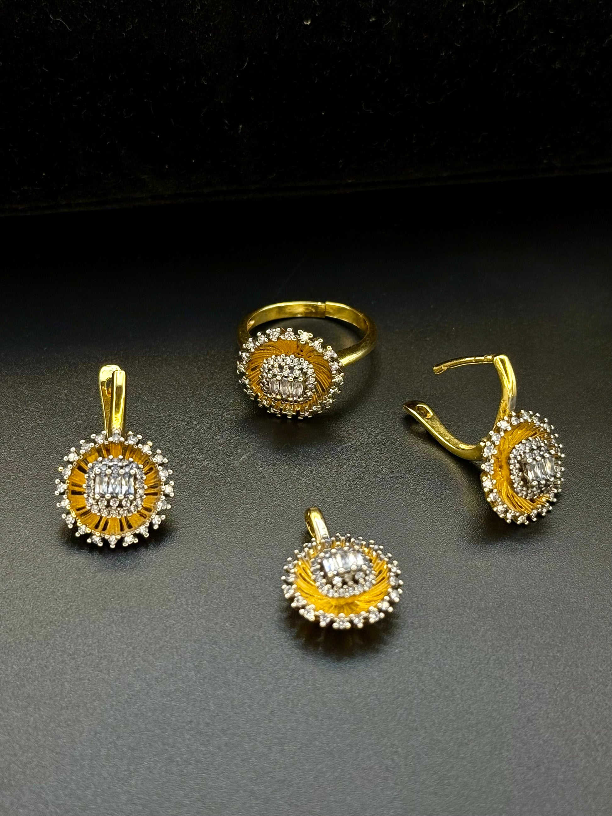 A dazzling blend of gold tones and cubic zirconia sparkle — the Suncrest Radiance Set brings timeless elegance to your everyday charm. Includes ring, earrings, and matching pendants.