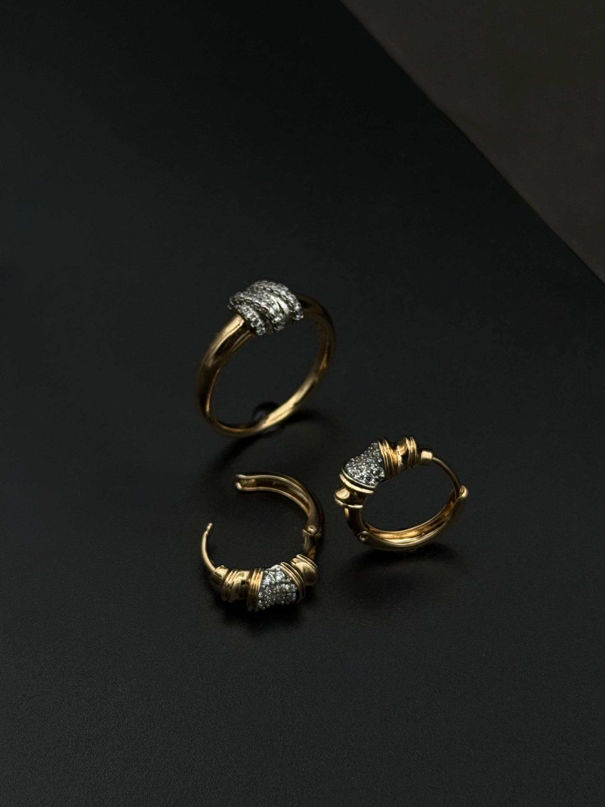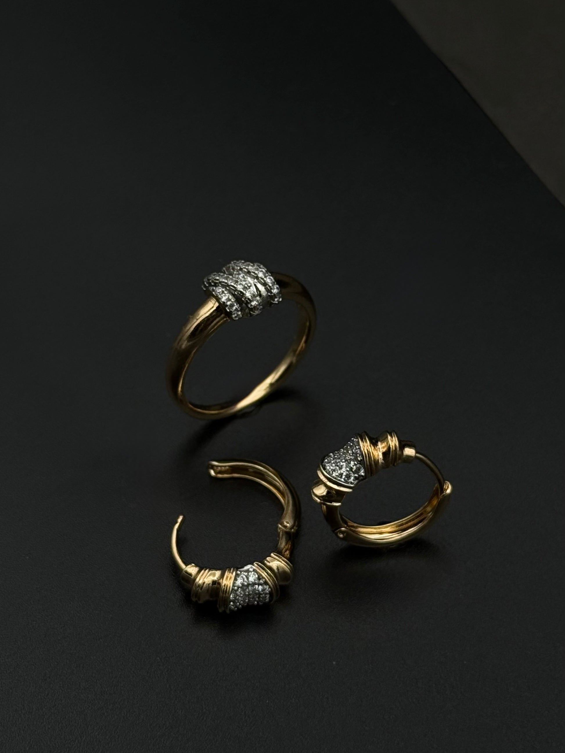 Elegant and refined, the Velouria Grace set features gold-plated hoops and a matching ring, each accented with pavé-set crystals for a soft, radiant sparkle. Inspired by the richness of velour and the essence of grace, this set adds a timeless touch to both everyday looks and special moments.