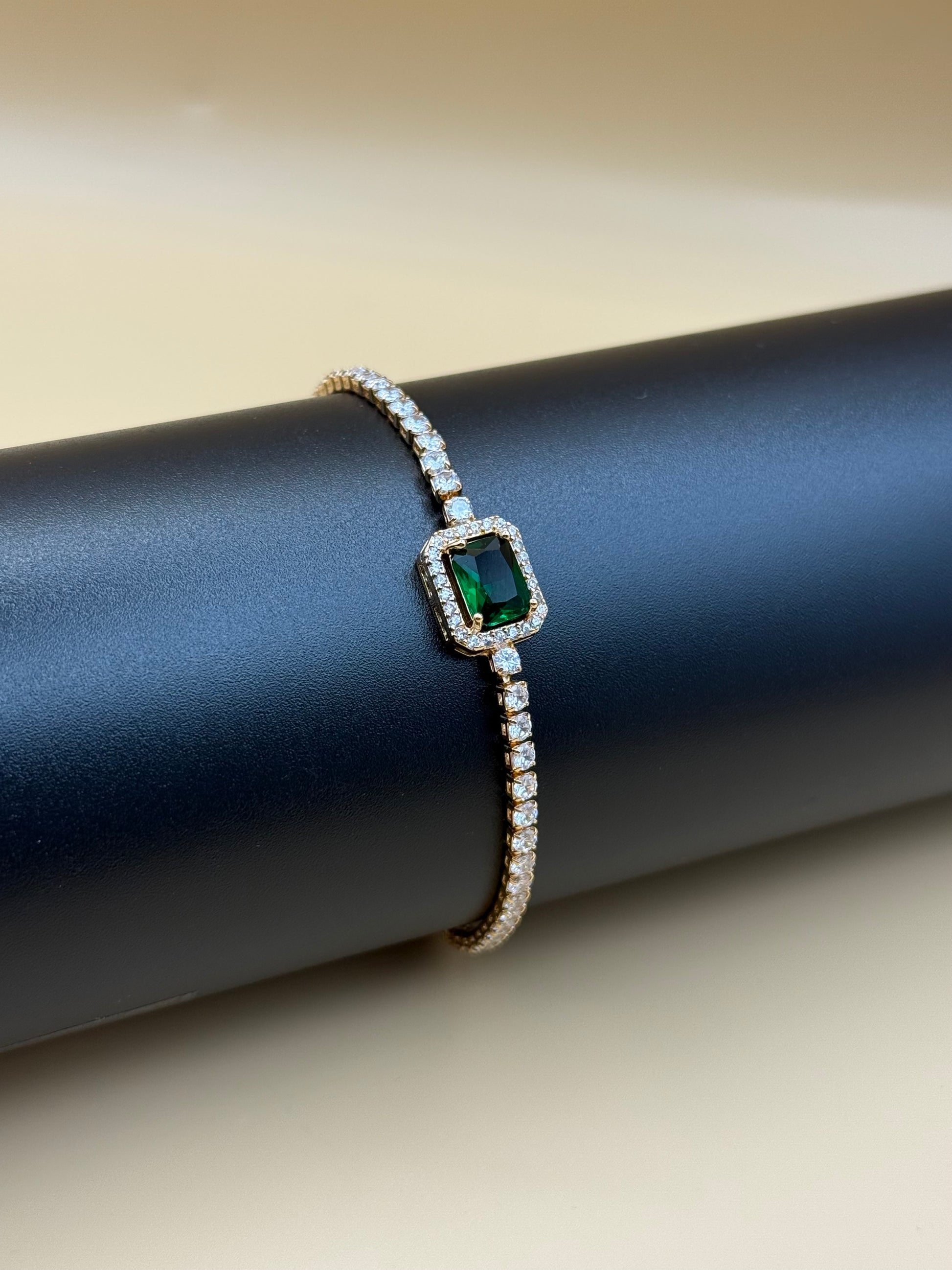A symbol of elegance and serenity, Verdant Halo features a rich emerald-green stone framed in a dazzling halo of fine zircons. Set on a delicate, gold-toned chain of shimmering stones, this bracelet brings a perfect balance of luxury and grace — ideal for both festive occasions and refined everyday wear.